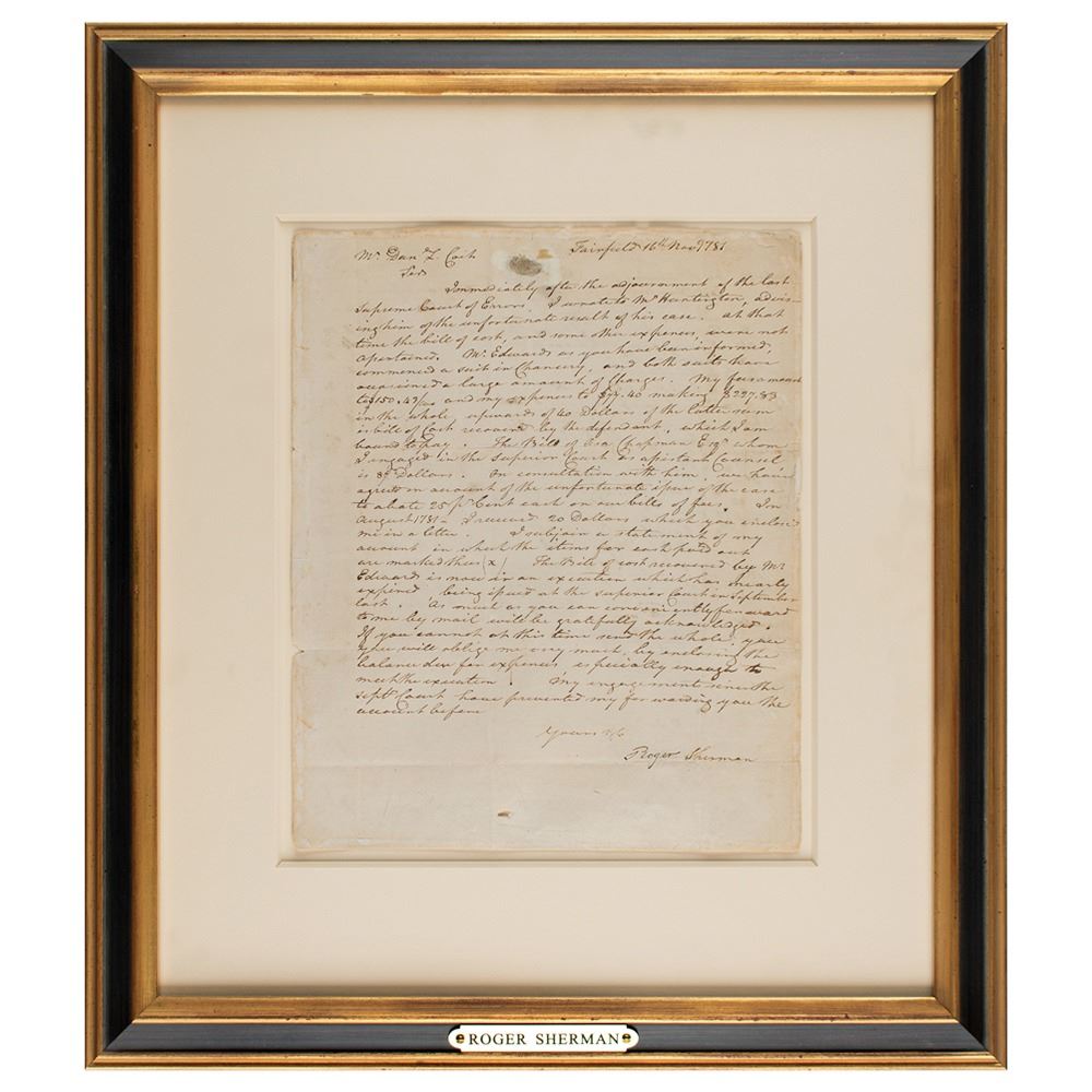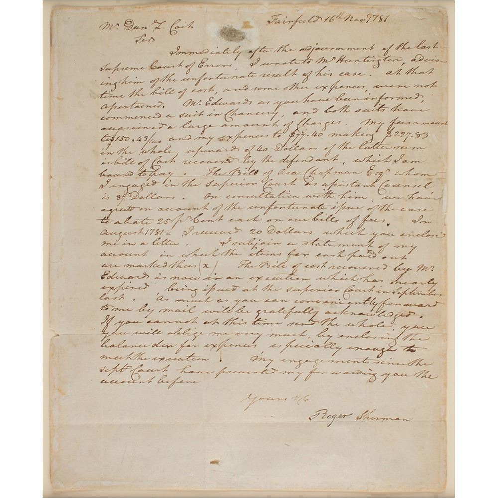 ALS, one page, 8 x 10, November 16, 1781. Handwritten letter concerning legal fees, in part: "Immediately after the adjournment of the last Supreme Court of Errors, I wrote to Mr. Huntington, advising him of the unfortunate result of his case. At that time the bill of cost, and some other expences, were not ascertained. Mr. Edwards as you have been informed, commenced a suit in Chancery, and both suits have occasioned a large amount of charges. My fees amount to…$227.83 in the whole…The Bill of Asa Chapman Esq'r whom I engaged in the Superior Court as assistant Counsel is 87 Dollars." Mounted, matted, and framed to an overall size of 14.75 x 16.75. In very good to fine condition, with an abrasion to the top center, and a small hole to the bottom.