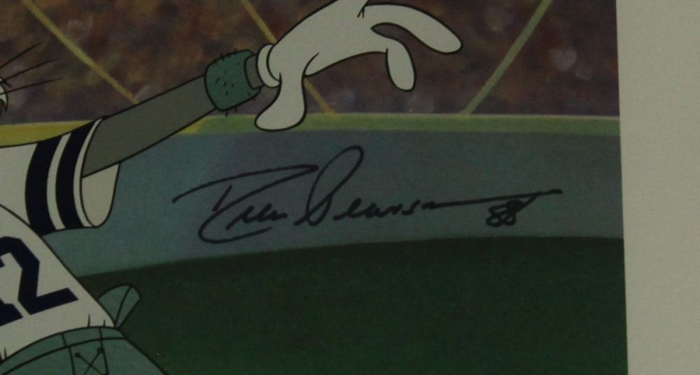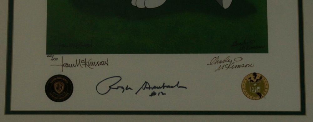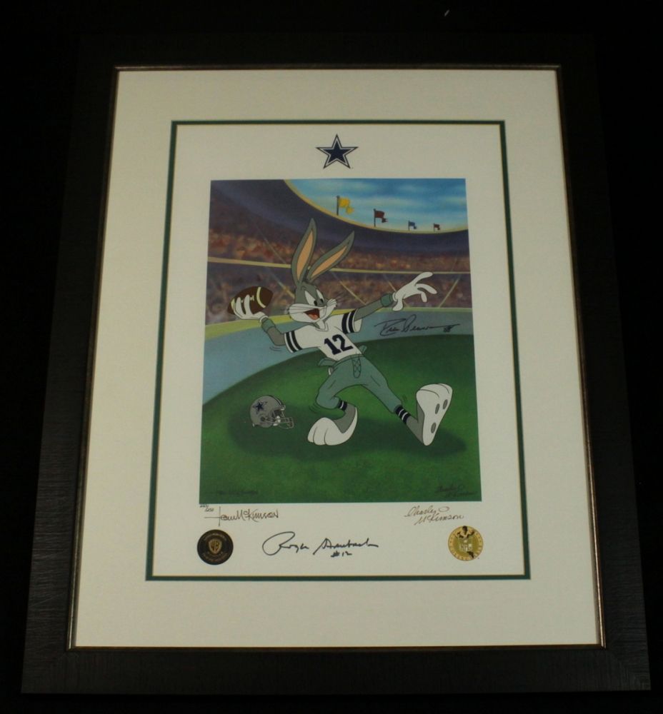 "Hail Mary" Warner Bros. Bugs Bunny Lithograph is a limited edition #223 of 250. Lithograph was created and hand-signed by Charles and Tom McKimson. Custom framed and matted to 26x32 in size. Hand-signed in felt-tip pen by Roger Staubach and Drew Pearson. Autographs include an authenticity guarantee and LOA from Pristine Auction.