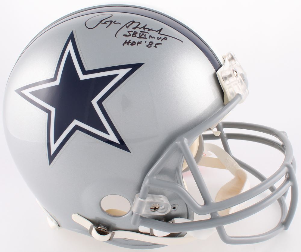Dallas Cowboys full-size authentic on-field helmet. Hand-signed and inscribed in black felt-tip pen by Roger Staubach (HOF).