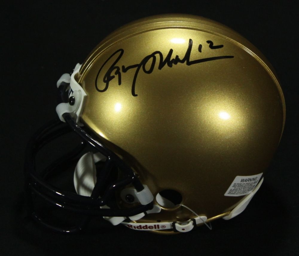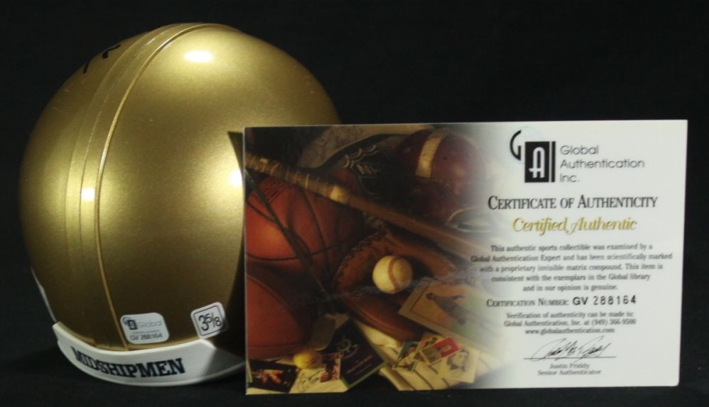 Riddell Navy mini-helmet hand-signed in black felt-tip pen by Roger Staubach (Cowboys HOF). The autograph includes a Global Authentics (GA) hologram and matching COA for authenticity purposes.