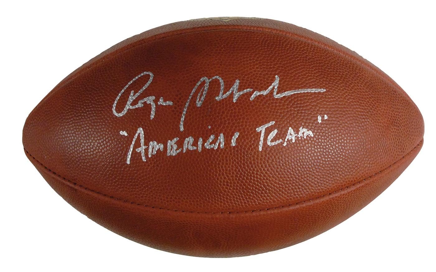 Official Wilson “The Duke” football signed in silver ink on a side panel, “Roger Staubach, ‘America’s Team.’” In very fine condition with a James Spence authentication label affixed to ball. Accompanied by a certificate of authenticity from James Spence.