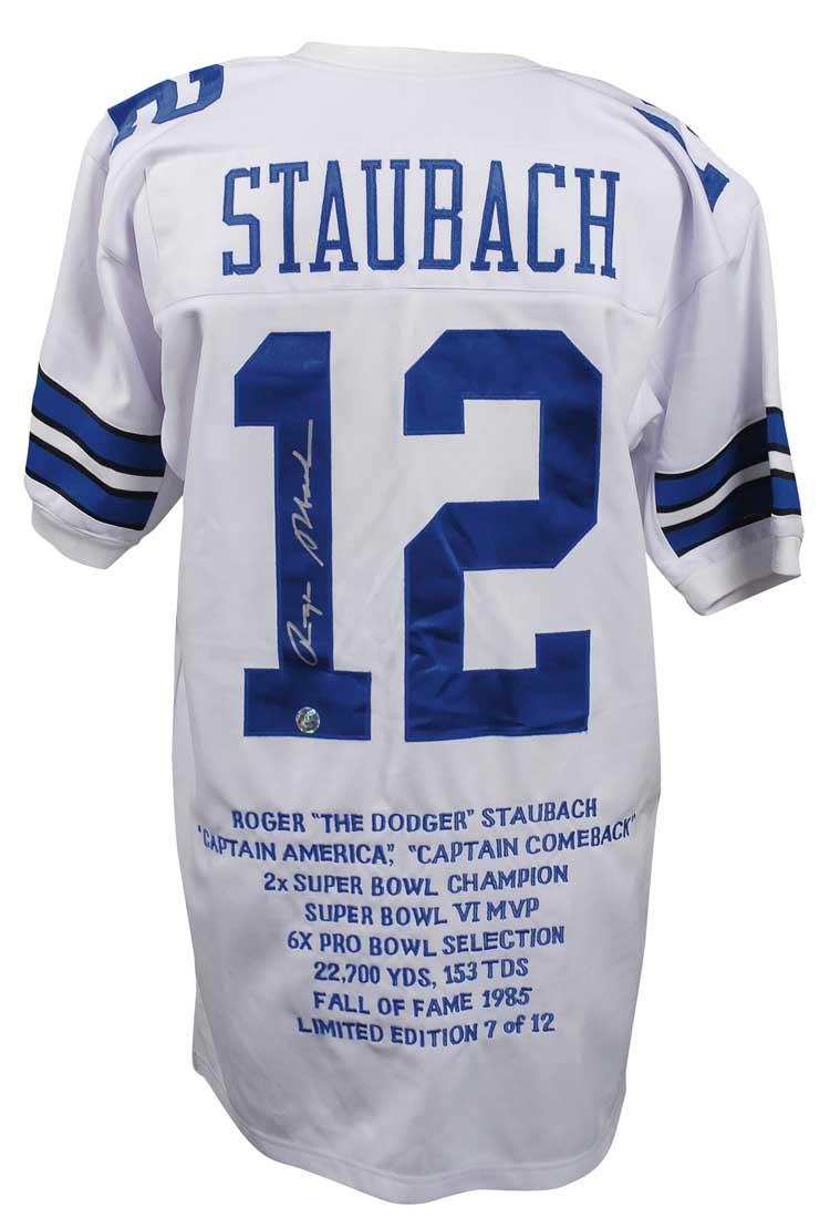 Limited edition replica Dallas Cowboys football jersey, #7/12, with sewn on letters and numbers, as well as Staubach’s career highlights embroidered on the reverse, signed in silver ink on the number on the back. In very fine condition. Pre-certified Steve Grad/PSA/DNA and RRAuction COA.
