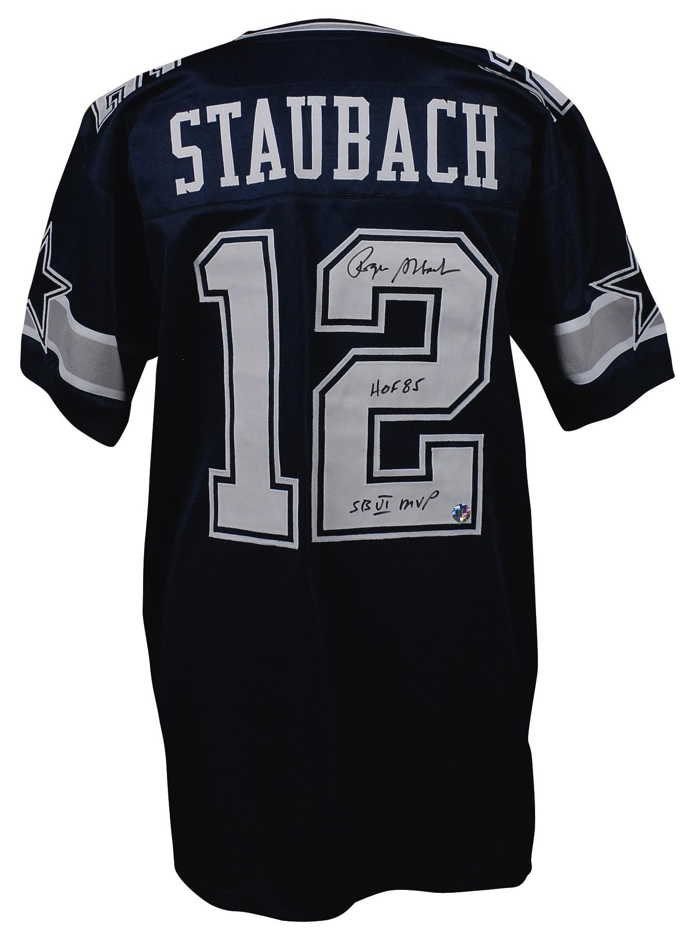 Replica Dallas Cowboys football jersey, with sewn on letters and numbers, signed in black felt tip on the number on the back, “Roger Staubach, HOF 85, SB VI MVP.” In very fine condition. Pre-certified Steve Grad/PSA/DNA and RRAuction COA.
