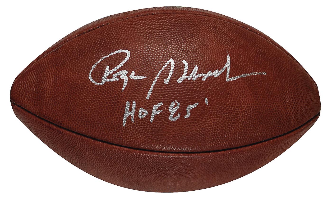 Official Wilson NFL football signed in silver ink on a side panel, “Roger Staubach HOF 85.” In fine condition. Accompanied by a certificate of authenticity from James Spence.