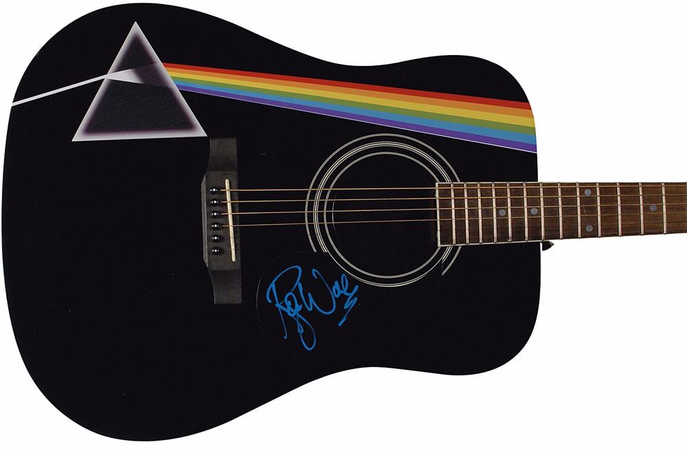 Black-bodied Epiphone DR-100 EB acoustic guitar with an affixed Dark Side of the Moon decal, signed on the black pickguard in blue paint pen by Waters. In fine condition.