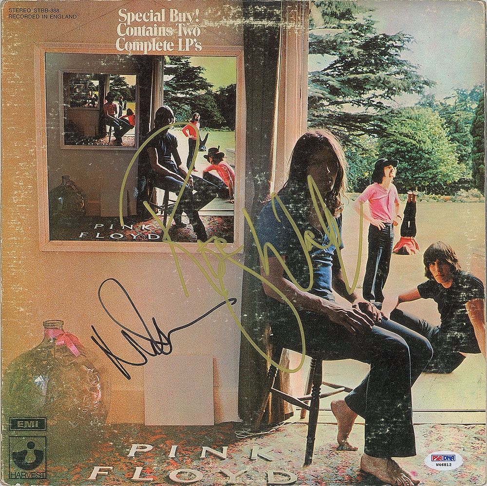 Ummagumma album signed on the front cover in gold ink by Waters, and in black felt tip by Mason. In very good to fine condition, with scuffing and edge wear. The record is not included. Accompanied by a certificate of authenticity from PSA/DNA.
