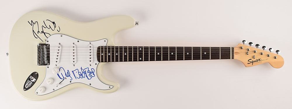 White-bodied Fender Squier Bullet Stratocaster electric guitar, signed on the body in black felt tip by Roger Waters and on the pickguard in blue felt tip by Nick Mason, who adds "Pink Floyd." In fine condition, with a couple small smudges to Mason addition. Accompanied by a full letter of authenticity from JSA.