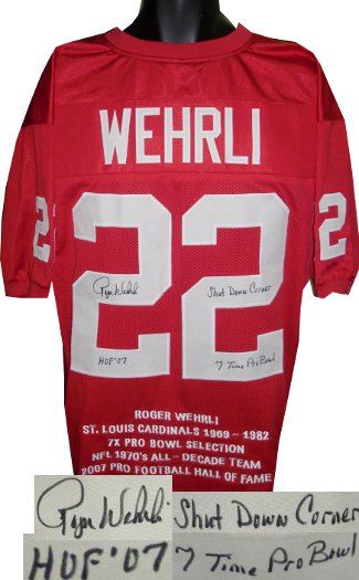 Roger Wehrli played cornerback his entire 14-year career with the St. Louis Cardinals from 1969 until 1982. He was a seven-time Pro Bowler after playing college football at the University of Missouri, where he was a consensus All-American and a first-round draft choice by the Cardinals in 1969. He was elected to the Pro Football Hall of Fame in 2007. Roger Wehrli has hand signed this St. Louis Cardinals Red Prostyle Jersey with 3 inscriptions including: HOF 07, Shut Down Corner, & 7 Time Pro Bowl and with Embroidered Stats. MAB Hologram and Certificate of Authenticity from Athlon Sports.