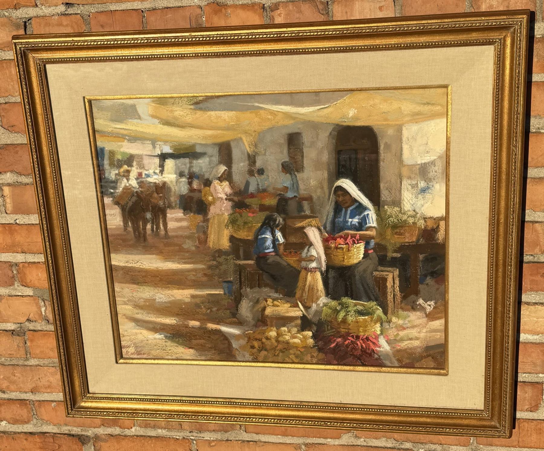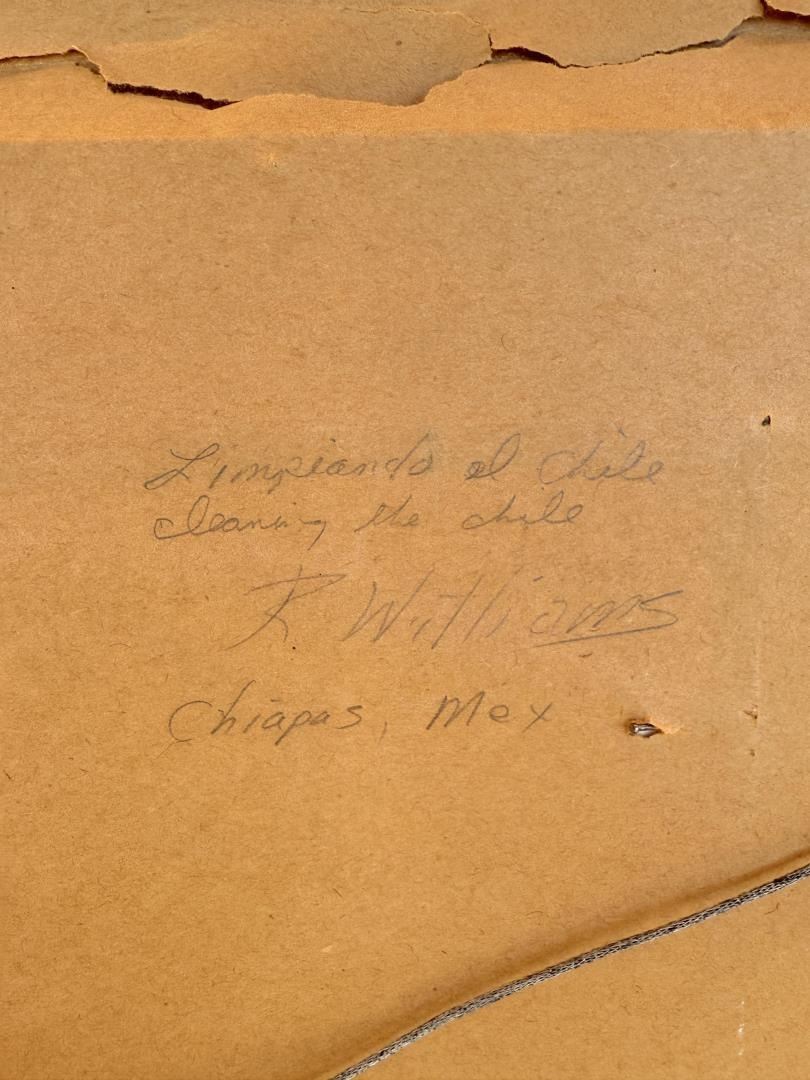 Title is Cleaning The Chili Chiapas Mexico. 28" by 32" framed. Roger Williams (Born 1954) is active/lives in New Mexico, Colorado. Roger Williams is known for Realist/impressionist Indian genre and landscape paintings. Roger William's travels began at an early age and led him to his art career. His father was an artist and advised Roger not to follow his career path. Roger graduated from high school in Alamosa, Colorado, saved enough money to travel to Europe and hitchhiked around. There he spent much of his time at the art museums - he was intrigued with the work and studied it as much as he could. After five months of travel, he returned to the States and acquired a scholarship to study art at the University of Denver. Soon after he received his Masters of Arts from Adams State College in Colorado. He started teaching right away at the university level and in workshops and at the time was working in watercolor and oils. Roger developed his own techniques through studying books from his father's collection as a professor of art. Roger abandoned his idea of painting in an ultra-realistic manner and moved toward his own style. When he moved to Santa Fe, he discovered pastels and soon about 70 percent of his work was in pastel.