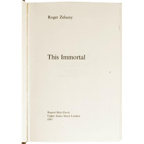 <B>Roger Zelazny:<I> The Immortal.</B></I></B></I> (London: Rupert Hart-Davis, 1967), first hardcover edition, 187 pages, jacket design by Ken Reilly, brown boards with gilt titles, 8vo (5.25" x 8"), slight cant to spine, else fine in a very good jacket with a small repaired fold on the upper left front cover. Author's first book and a 1966 Nebula nominee. <I>From the Ventura Collection.</B></I><BR><BR><b>Shipping:</b> Books & Catalogs (<a target="_blank" href="http://www.heritageauctions.com/common/shipping.php">view shipping information</a>) <BR><BR><B>Important notic