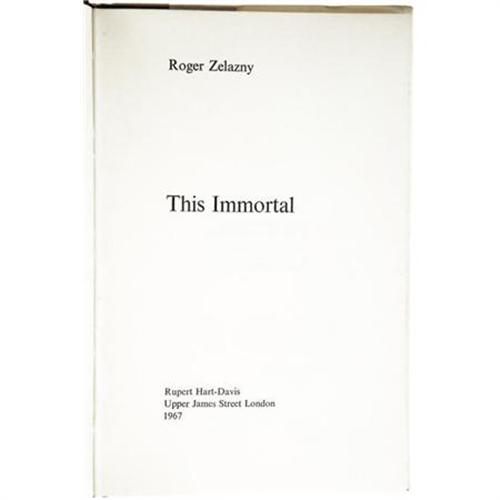<B>Roger Zelazny: <I>This Immortal</B></I></B></I> <B>with Signature Card Laid In</B></I> (London: Rupert Hart-Davis, 1967), first hardcover edition, 187 pages, jacket design by Ken Reilly, brown boards with gilt titles, 8vo (5.25" x 8"), dust jacket. Card signed "<I>Roger Zelazny</B></I>" laid in. Author's first book and a 1966 Nebula nominee. Book has slight cant to the spine, and mild foxing along the textblock edges, else fine in a very good dust jacket.<BR><BR><b>Shipping:</b> Books & Catalogs (<a target="_blank" href="http://www.heritageauctions.com/common/shipping.php">view shipping information</a>)