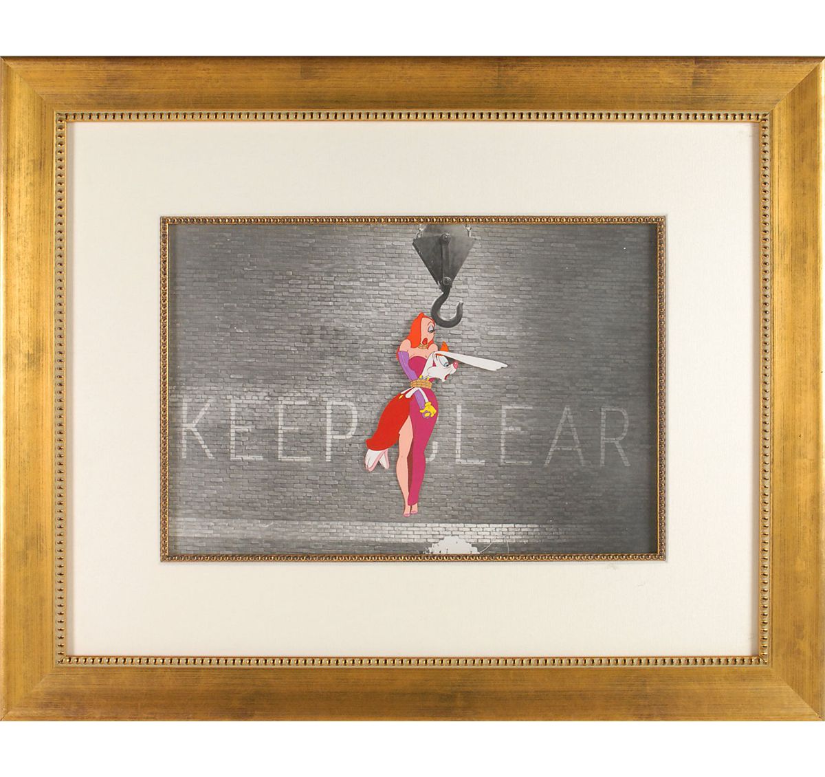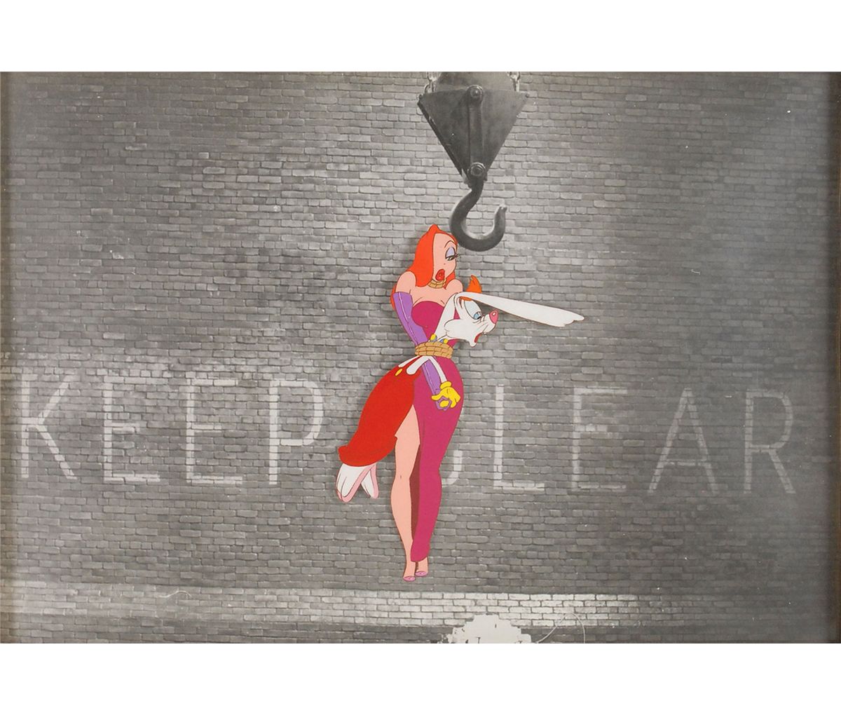 (Walt Disney Studios, 1988) Original production cel featuring Roger and Jessica Rabbit from Who Framed Roger Rabbit?, showing them tied up together. The cel is placed on a matching studio copy background. Image measures 4 x 6.5, with a mat opening of 15 x 10. This piece is also framed to an overall size of 25.5 x 20.75. Walt Disney Studios certificate of authenticity included. In fine condition.