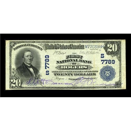 <B>Rogers, AR</B></I> - $20 1902 Plain Back Fr. 650 <B>The First NB</B></I> Ch. # (S)7789<BR>This is one of the more available (although hardly common) small town Arkansas banks in large size, although Series 1929 notes are still unreported from this institution. As befits a collection of this scope and power, this piece is as nice or nicer than any of the other examples listed in the census to date. Pleasing <B>Very Fine,</B></I> with vivid purple signatures.<BR><BR><b>Shipping:</b> Coin/Currency (<a target="_blank" href="http://www.heritageauctions.com/common/shipping.php">view shipping information</a>)