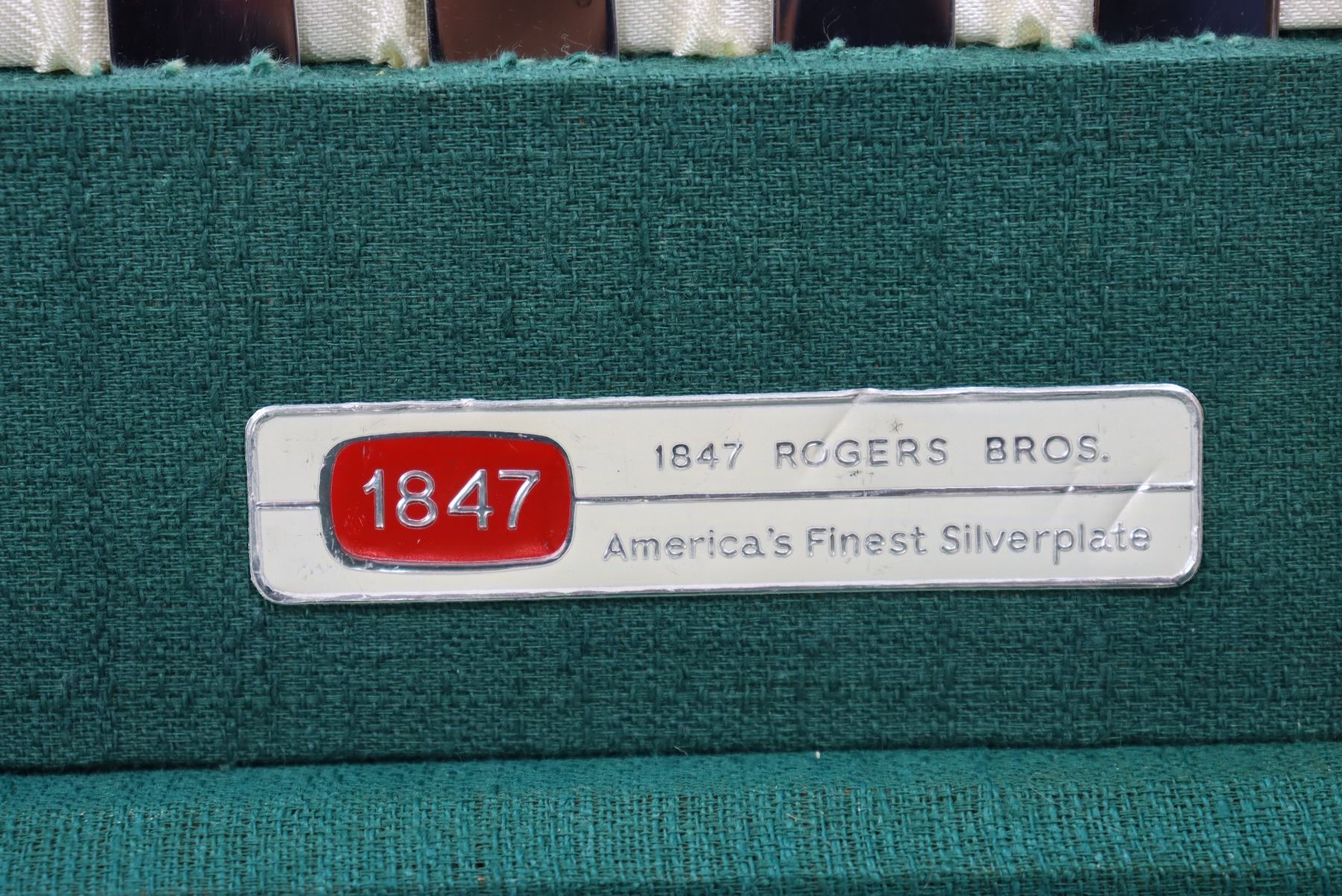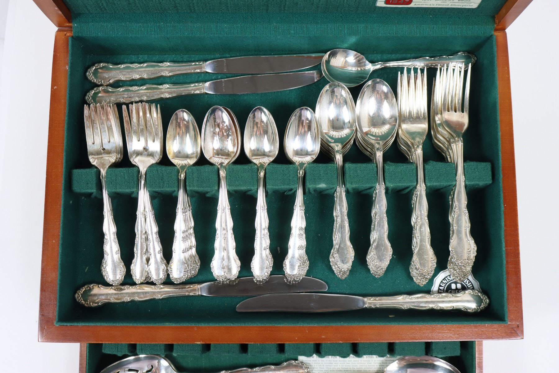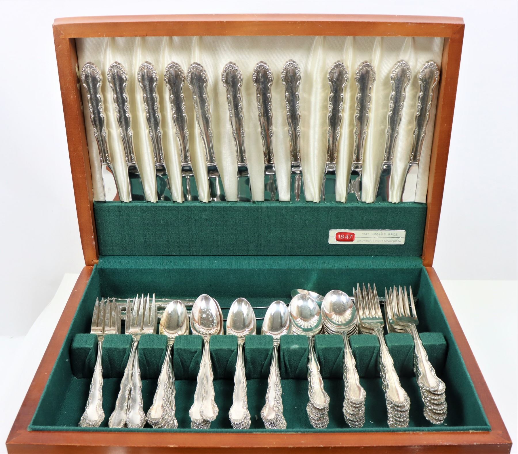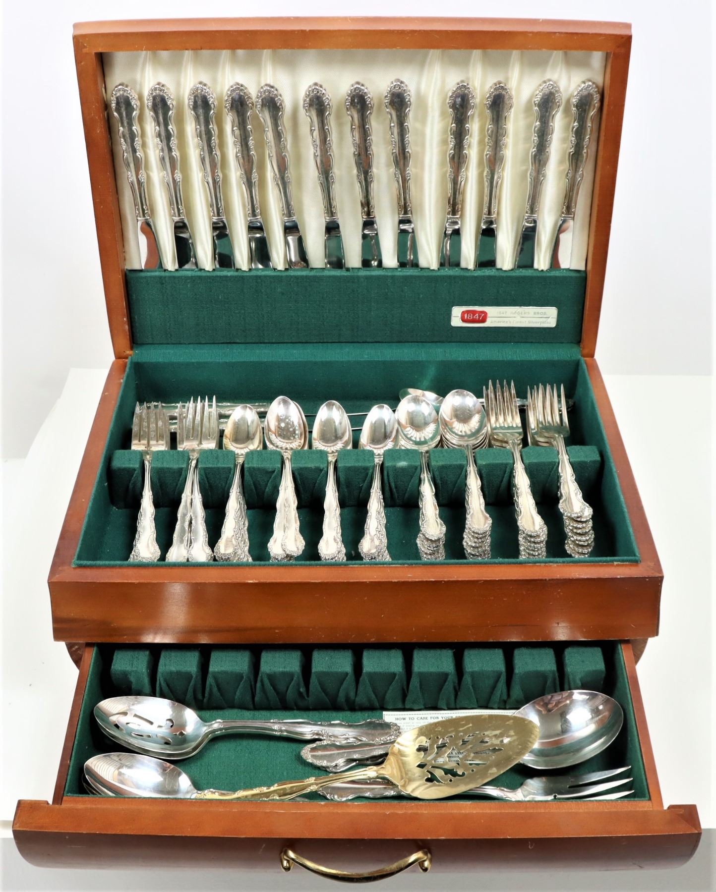 90 piece set of Rogers Bros. silver plate flatware in the 'Flirtation' pattern. Comes in lovely lined display box with open top and drawer.