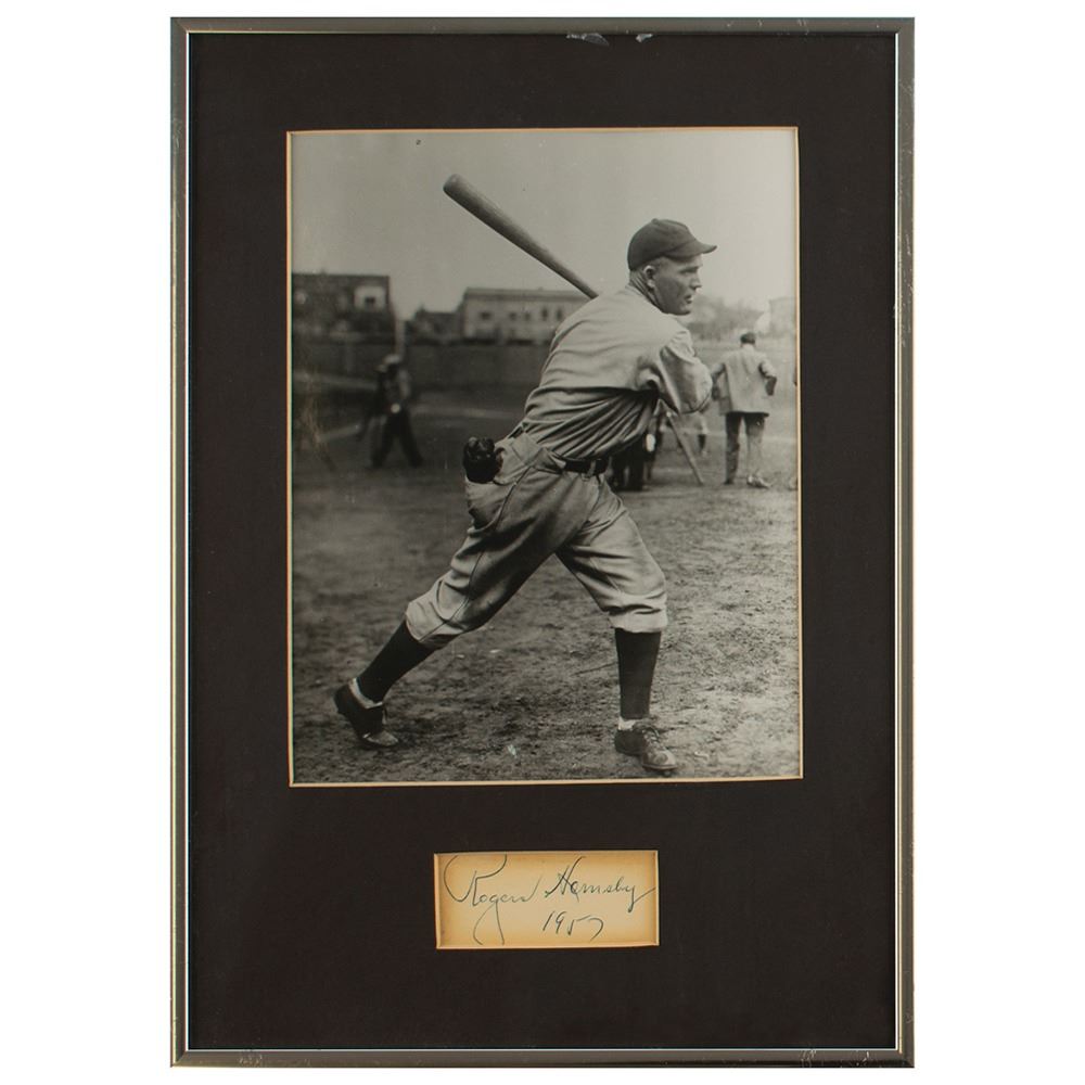 Vintage ballpoint signature, "Roger Hornsby, 1957,†on an off-white 3 x 1.25 sheet. Matted and framed with a photo to an overall size of 10.25 x 14.5. In very good to fine condition, with toning to the perimeter. Accompanied by a full letter of authenticity from JSA.