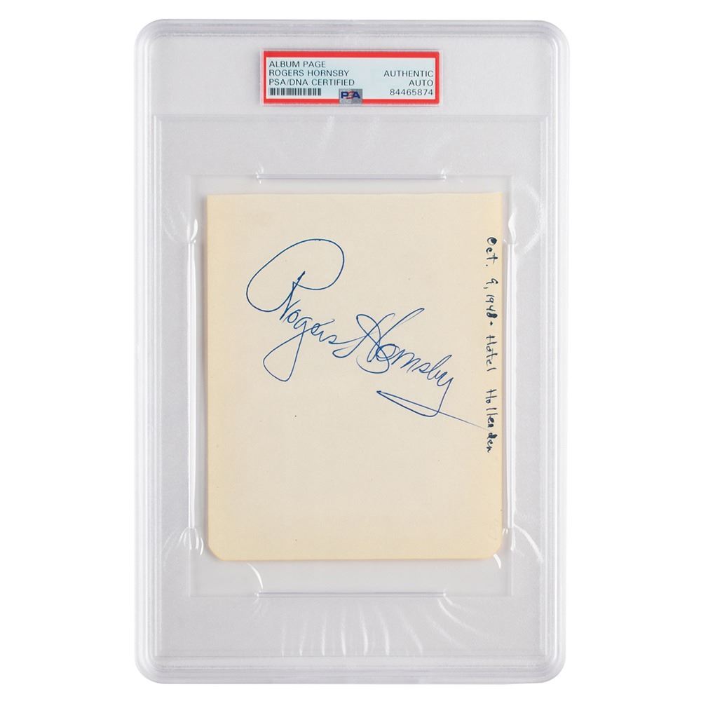 Large and bold fountain pen signature, "Rogers Hornsby,†on an off-white 5.5 x 4.5 album page, annotated along the top by the collector: "Oct. 9, 1948 - Hotel Hollenden." In very fine condition. Encapsulated in a PSA/DNA authentication holder.