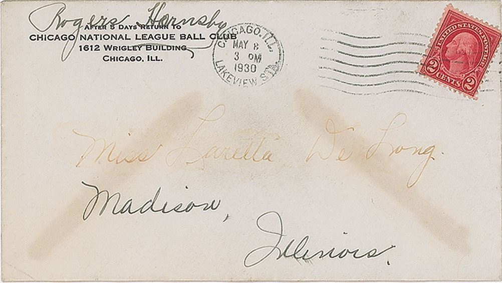 Chicago National League Ball Club mailing envelope, postmarked in Chicago, Illinois, on May 3, 1930, addressed in fountain pen by Rogers Hornsby, who signs in the upper left corner. In very good to fine condition, with light soiling, and two envelope glue-related stains.