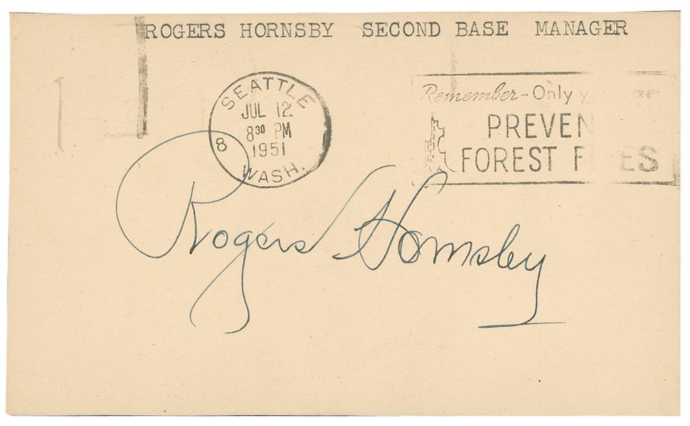 Hall of Famer. A two-time MVP and two-time Triple Crown winner, was the player-manager of the Cardinals’ first World Championship team in 1926 and was the first National League player to hit 300 home runs. Vintage ink signature, “Rogers Hornsby,” on an off-white 5 x 3 government postcard (postmarked 7/12/51). In fine condition, with postmarks and typed notations to signature side, a couple lightly touching signature.