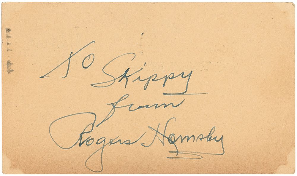Vintage fountain pen signature and inscription, “To Skippy, from Rogers Hornsby,” on an off-white 5.5 x 3.25 government postcard (postmarked 6/11/1949). In fine condition, with moderate toning from previous display and a light post stamp at beginning of inscription. Accompanied by an unsigned glossy 8 x 10 photo of Hornsby in a Cardinals uniform.