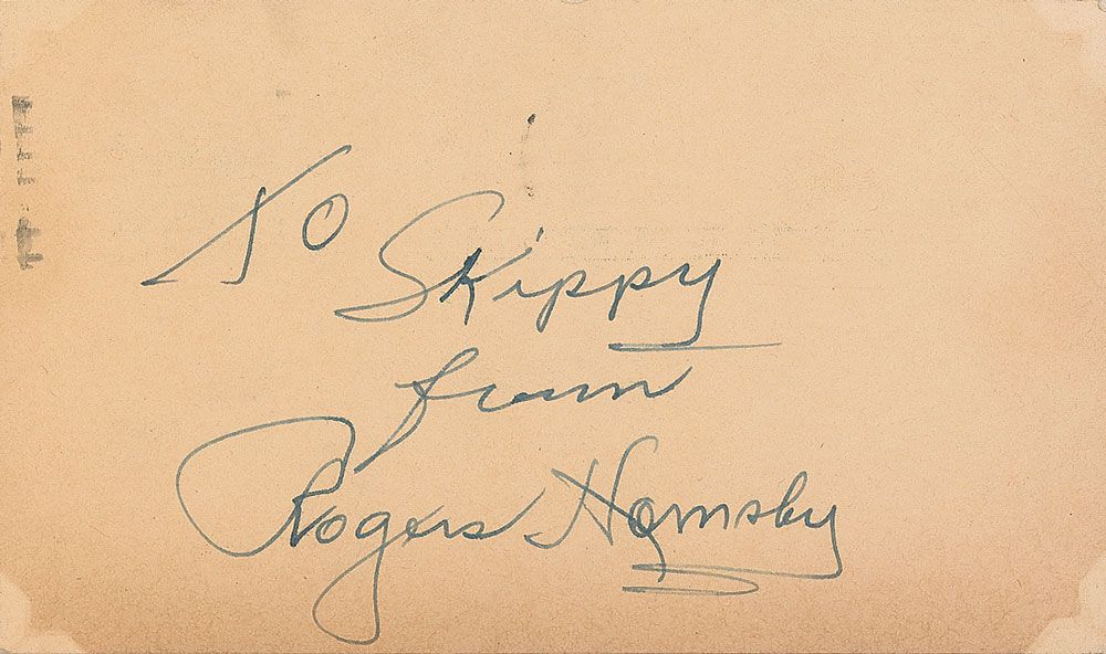 Vintage fountain pen signature and inscription, “To Skippy, from Rogers Hornsby,” on an off-white 5.5 x 3.25 government postcard (postmarked 6/11/1949). In fine condition, with moderate toning from previous display and a light post stamp at beginning of inscription. Accompanied by an unsigned glossy 8 x 10 photo of Hornsby in a Cardinals uniform.