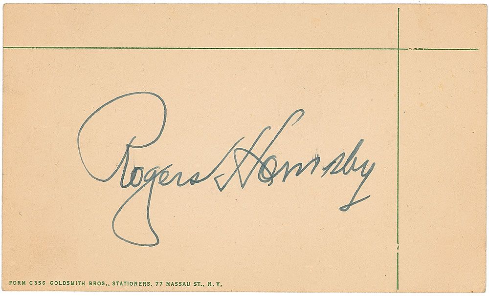 Vintage fountain pen signature, “Rogers Hornsby,” on an off-white 5 x 3 card. In fine condition.
