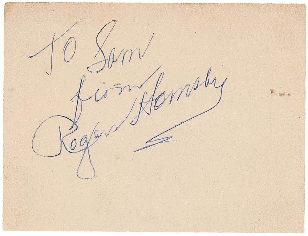 Legendary second baseman and Hall of Famer (1896–1963) known as one of the best hitters of all-time, finishing his career with a batting average of .358. Ballpoint signature and inscription, “To Sam, from Rogers Hornsby,” on an off-white 5.75 x 4.5 album page. In fine condition, with a few tiny stains.