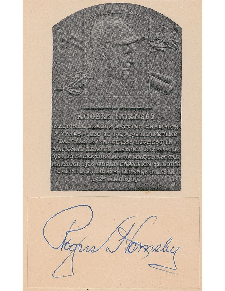 Ballpoint signature, “Rogers Hornsby,” on an off-white 3.5 x 1.75 clipped card affixed to a larger 3.5 x 5.75 card bearing an affixed image of a Hall of Fame plaque honoring Hornsby. In fine condition, with a trivial spot of adhesive below image.