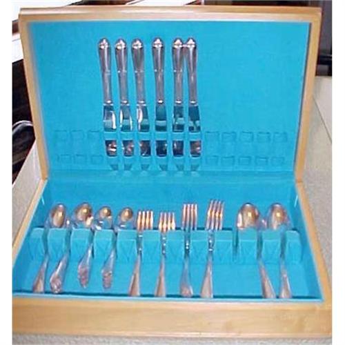 Offering this vintage silverplated flatware set made by International Rogers & Bros, reinforced plate IS, pattern is called Inspiration, circa 1933. Near fine condition, no silver loss, no dents in knife handles, fork tines are straight, normal very minor wear marks from use. Marked on back Rogers & Bros Reinforced Plate IS. Comes in a lovely blonde maple wood box with bright 1950's aqua tarnish resistant lining. Box is in good++ condition, no cracks or broken pieces, inside is good++ also. Lovely additions to your set or a wonderful gift!