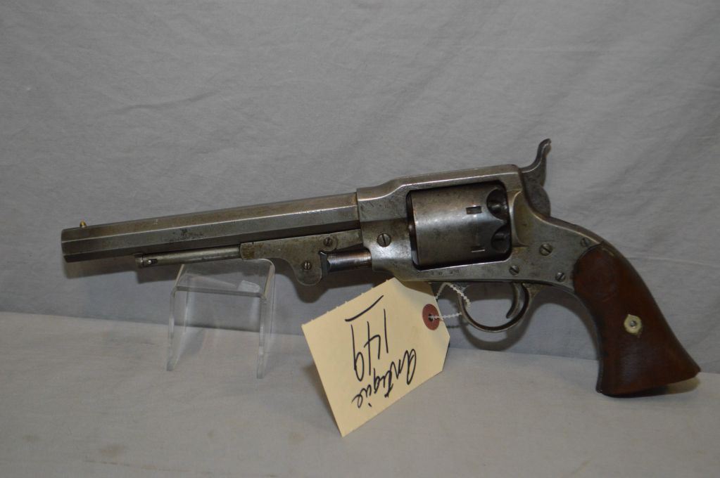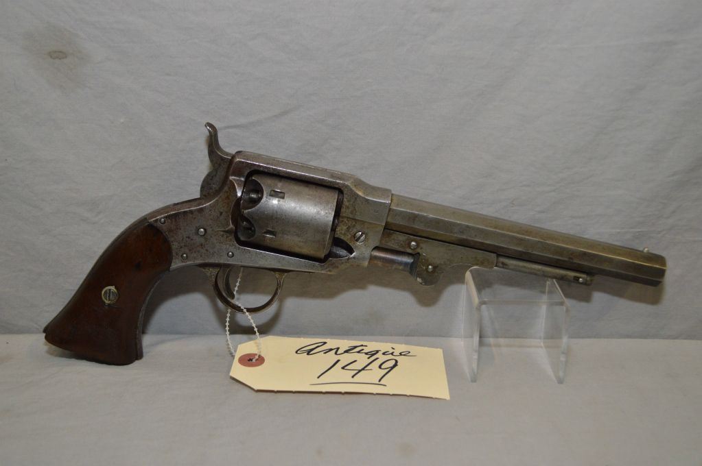 Rogers & Spence Model Army .44 Perc Cal 6 Shot Revolver w/ 7 1/2" octagon bbl [ blued finish faded to grey in most areas, case hardened hammer & lever, two piece walnut grips, both with small chips, right grip also has five notches, solid frame type, with single action mechanism, top of frame marked "Rogers & Spence, Utica.N.Y.", barrel and frame, hammer stamped with B various places, Total Production Estimated 5,800 of which 800 would have been for Civilian usage, Civil War era, Circa 1865, matching numbered cylinder ] Ser # 4020 ANTIQUE NO PAL REQ