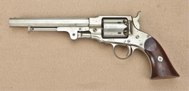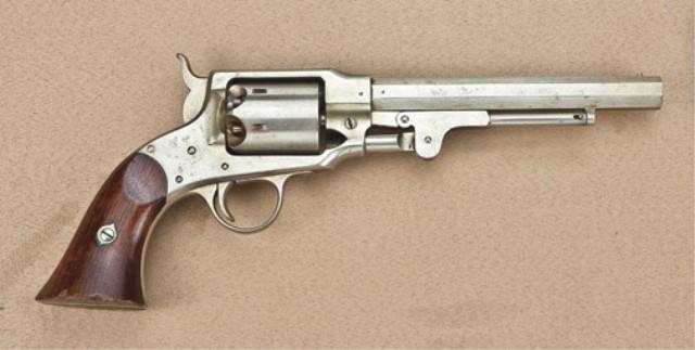Rogers & Spencer .44 caliber percussion, Civil War era revolver, US martially marked and inspected, serial #2294. The revolver shows 90-95% of an old renickel plate that is yellowing and showing some small areas of flaking. The grips show a sharp cartouche on left and some dings small losses at the edges. The action is crisp, the interior excellent. Markings sharp. Est: $700 - $1,400