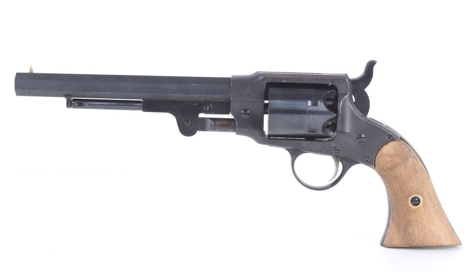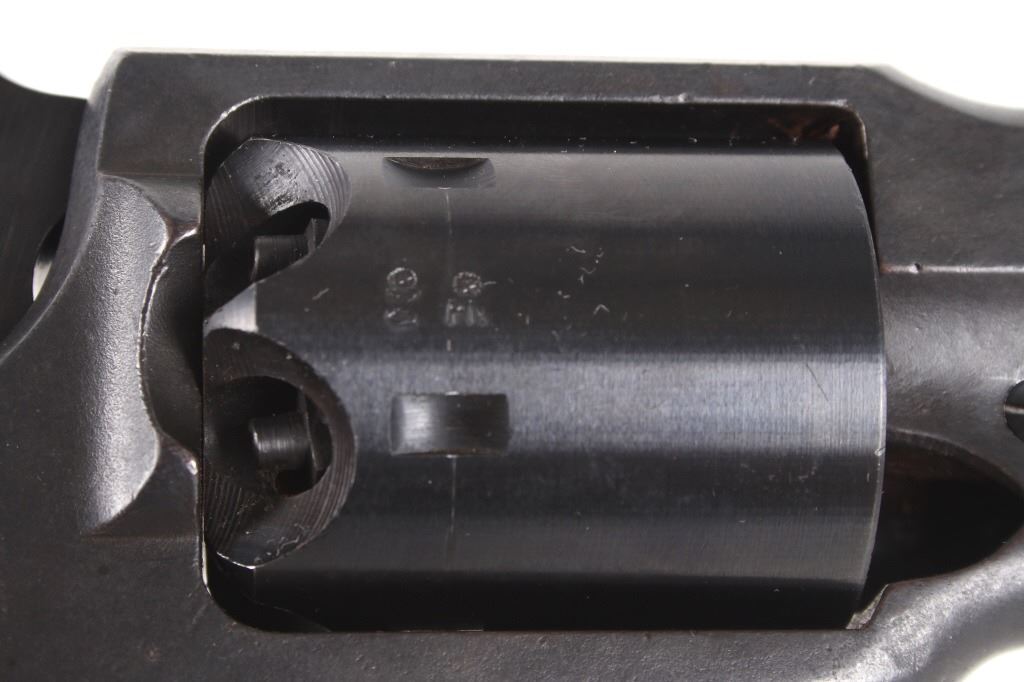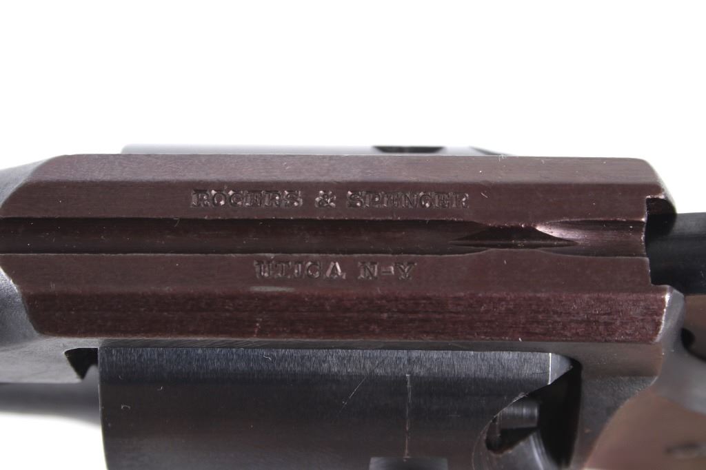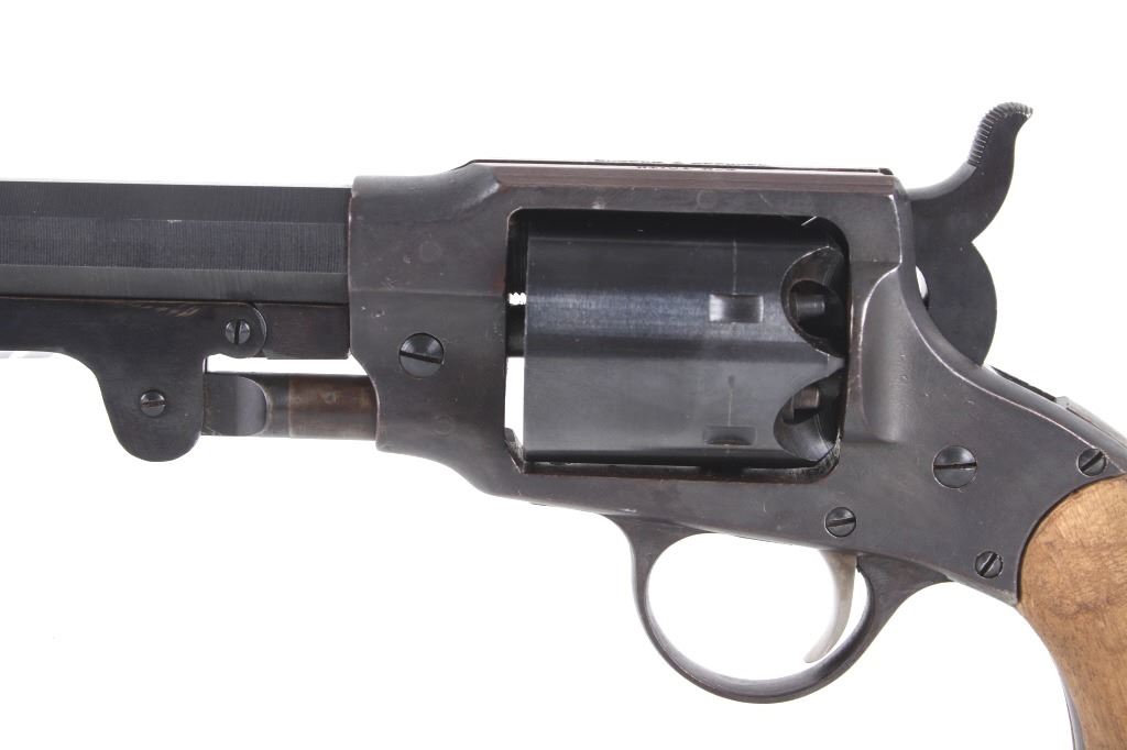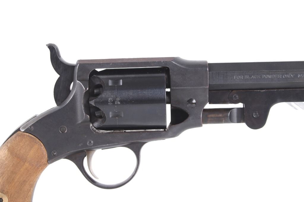 For your bidding pleasure is a Rogers and Spencer Model 1858 Remington New Army frame Euroarms revolver and chambered in .44 Cal. This revolver utilizes a 7 1/2" octagonal barrel, six shot cylinder, hammer, and trigger. The revolver frame is modeled after the Remington Model 1858 New Army revolver with some changes and replaced parts. The wood grips show a rough unfinished exterior and fitted to the frame. The side of the barrel is marked "FOR BLACK POWDER ONLY MADE IN ITALY" with the top of the frame marked with "Rogers & Spencer Utica N-Y". The frame and cylinder show multiple import hallmarks. Serial Number: 997. Black powder firearms do not require a FFL Transfer or NICS Background Check.