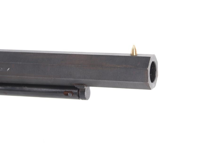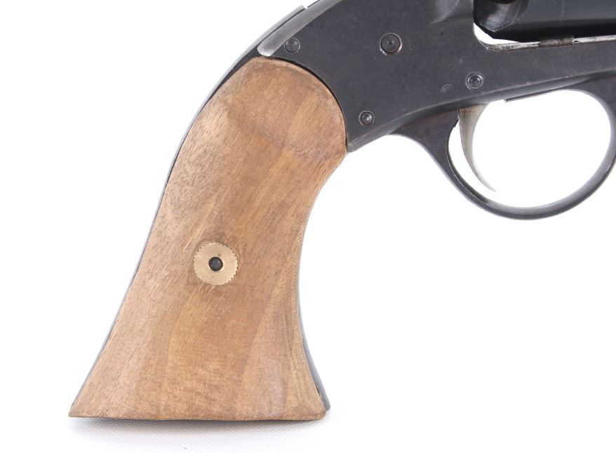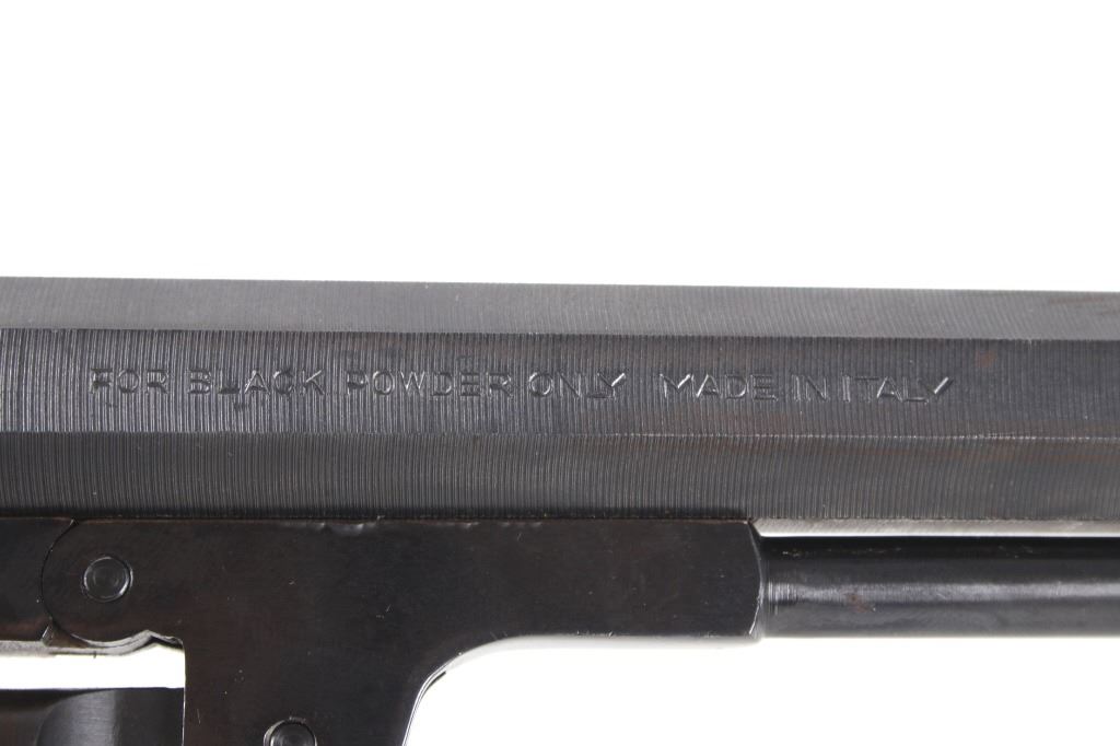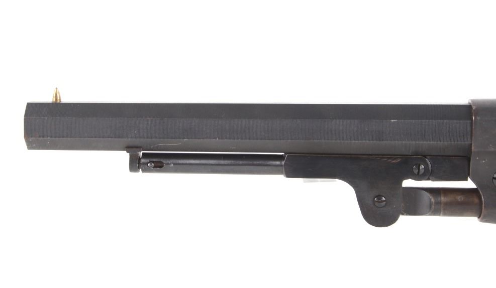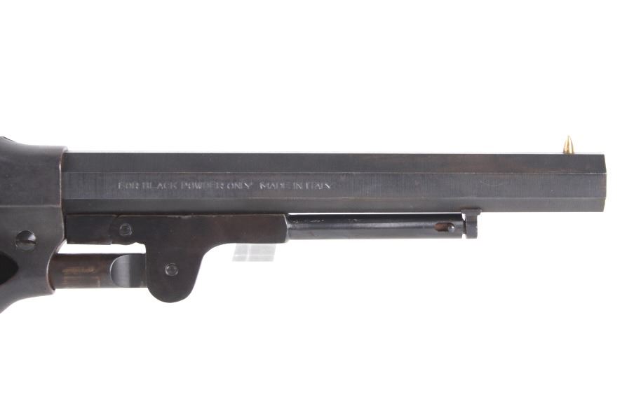 For your bidding pleasure is a Rogers and Spencer Model 1858 Remington New Army frame Euroarms revolver and chambered in .44 Cal. This revolver utilizes a 7 1/2" octagonal barrel, six shot cylinder, hammer, and trigger. The revolver frame is modeled after the Remington Model 1858 New Army revolver with some changes and replaced parts. The wood grips show a rough unfinished exterior and fitted to the frame. The side of the barrel is marked "FOR BLACK POWDER ONLY MADE IN ITALY" with the top of the frame marked with "Rogers & Spencer Utica N-Y". The frame and cylinder show multiple import hallmarks. Serial Number: 997. Black powder firearms do not require a FFL Transfer or NICS Background Check.