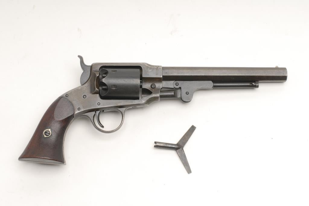 Rogers & Spencer single action percussion revolver, .44 caliber, 7.5” octagon barrel, blued and case hardened finish, S/N 4812, in overall very good + condition; muted blue on cylinder with an area of pitting; traces of blue mixed withplum patina on barrel, frame has gone to silver tone, crisp action, sharp markings, very good + bore; fine grips. Accompanied by a combination nipple wrench/screwdriver. (Antique). Est.: $1,000-$2,000.