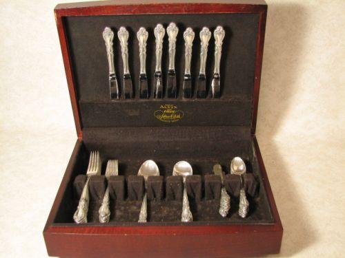 Beautiful 50 Piece Rogers International Sterling Silver Flatware Set in the 1951pattern OLD CHARLESTON presented in Mahogany Chest. Marked "Rogers" Anchor "IS" touchmarks "Sterling". The utensils in this service are all in excellent condition, displaying only the minimal fine polishing lines one would expect to see in well-tended and seldom used quality sterling silverware, no damage or deep scratching, no monograms or removals. All tines are straight, all edges and pattern decoration are crisp and clean. All bowls are bright. All blades are clean and well attached to the handles with no looseness or paraffin rattle. Of special note is the quality and condition of this set. The Mahogany chest has a deep burgandy lining. The chest is scuffed and scratched but of excellent quality and provides a great seal for the tarnish-resistant lining. The Set consists of --- 8 Knives 9.125" --- 8 Dinner Forks 7.25" --- 8 Salad/Dessert Forks 6.5" --- 8 Soup/Cream Spoons 6.5" --- 8 Teaspoons 6" --- 8 Butter Spreaders (flat handle) 5.75" --- 2 Serving Spoons 8.5". Box measures 15.25" x 12.25" x 3.5".
