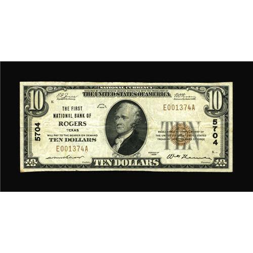 <B>Rogers, TX</B></I> - $10 1929 Ty. 1 <B>The First NB</B></I> Ch. # 5704<BR>As is the case with so many Texas banks, large notes outnumber small by a two to one ratio. This is the finest of the seven Series 1929 notes listed in the census. Bright <B>Very Fine.</B></I><BR><I>From The Rolling Plains Collection</B></I><BR><BR><b>Shipping:</b> Coins & Currency (<a target="_blank" href="http://www.heritageauctions.com/common/shipping.php">view shipping information</a>)