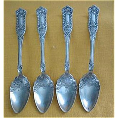 This vintage set of 4 silverplated fruit/orange spoons are marked: Wm.Rogers and Son AA. The beautiful scalloped pattern that goes into the bowl is Romanesque from 1898. In very good condition, in need of a good cleaning, they measure 5 3/4 inches long with a 1 1/2 by 2 inch bowl. A nice addition to any Holiday Table setting or Silverplate Flatware Collection.<BR>SH & Ins. will be quoted after orders placed. If you have any questions please contact me and thank you for looking.