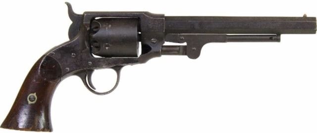 Rogers and Spencer Army .44 cal. SN 2XXXpercussion revolver with 7 1/2" barrel, originally blued with case hardened frame and two piece walnut grips, all made in 1865, top of frame marked Rogers and Spencer Utica NY, serial numbers matching on frame, barrel, cylinder, loading lever and backstrap, grips show strong RRB cartouche on left side, moderate chips on right side, various inspector initials on rest of revolver, all metal surfaces show a brown dark patinauncleaned, the action is tight, cylinder does not always index. From Dillman Ash collection. Antique. Est. 500-1000