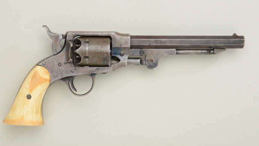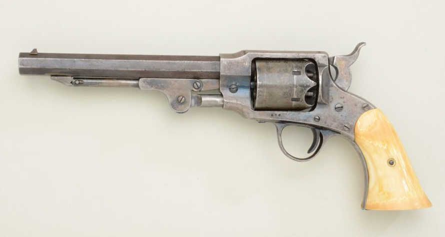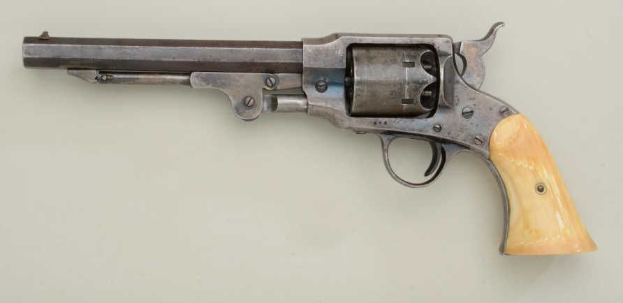 Rogers and Spencer single action percussion revolver, .44 cal., 7-1/2” octagon barrel, blue finish, ivory grips, #970. This gun is in overall good to very good condition showing traces of original blue in protectedareas, matching visible serial numbers, good bore, action is working but slightly weak; ivory grips are beautiful with nice graining and age checkering on the butt areas; loading lever front piece is an old replacement;from an old collection. Est.: $900-$1,800.