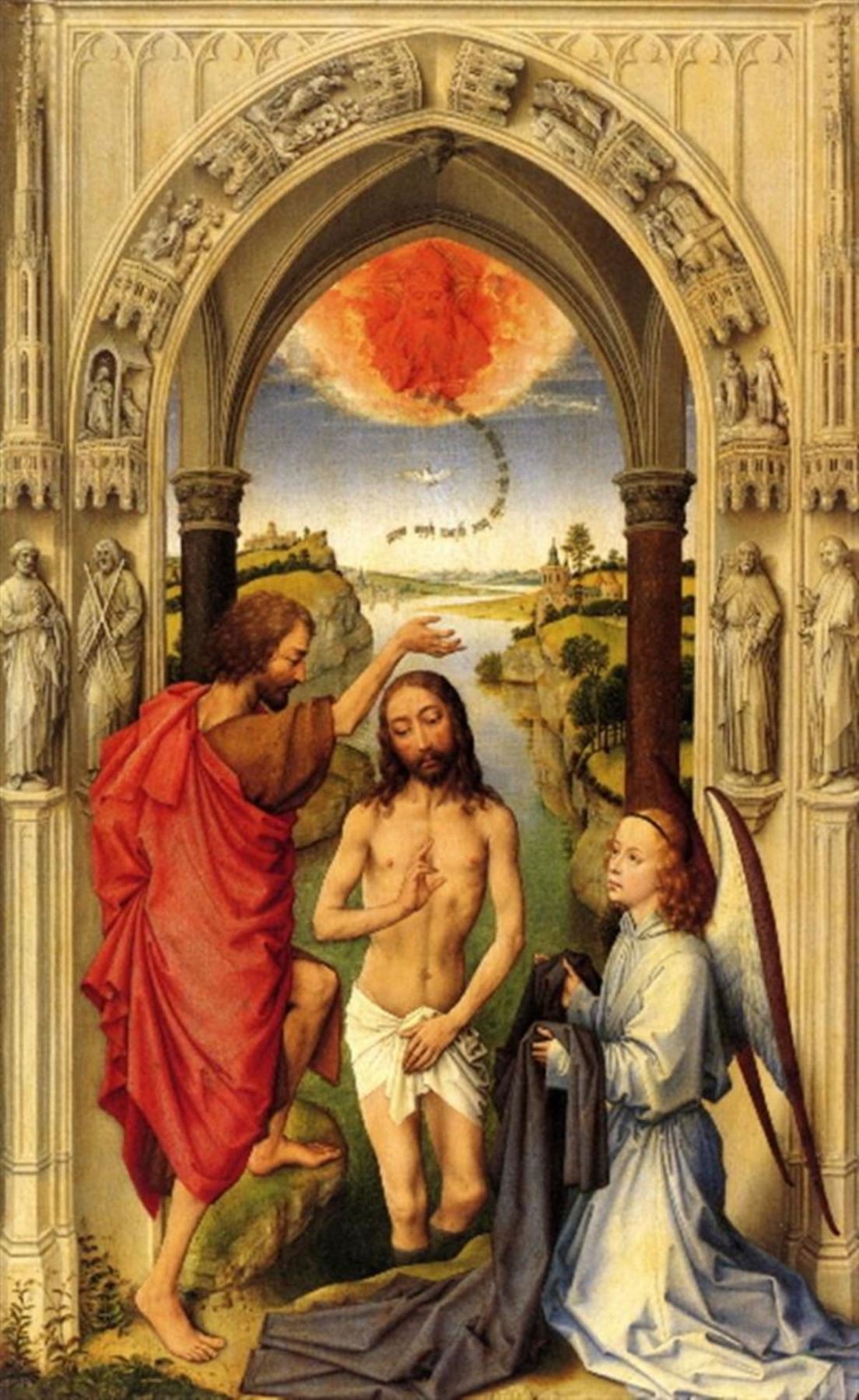 Artist: Rogier van der Weyden  - Title: Baptism of Christ  - Medium: Fine Art Giclee on Canvas - mage Size: Approximately 32 inches x 19.5 inches  - Unframed on Unstretched Canvas - Biography: Rogier van der Weyden, or Roger de la Pasture (1399 or 1400 - 18 June 1464) was an Early Netherlandish painter whose surviving works consist mainly of religious triptychs, altarpieces and commissioned single and diptych portraits. He was highly successful in his lifetime; his paintings were exported to Italy and Spain, and he received commissions from, amongst others, Philip the Good, Netherlandish nobility, and foreign princes. By the latter half of the 15th century, he had eclipsed Jan van Eyck in popularity. However his fame lasted only until the 17th century, and largely due to changing taste, he was almost totally forgotten by the mid-18th century. His reputation was slowly rebuilt during the following 200 years; today he is known, with Robert Campin and van Eyck, as the third (by birth date) of the three great Early Flemish artists (Vlaamse Primitieven or "Flemish Primitives"), and widely as the most influential Northern painter of the 15th century.