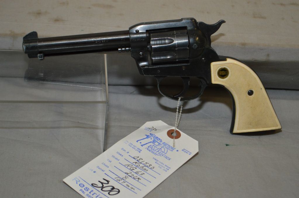 Rohm Model RG 63 .22 LR Cal 8 Shot Revolver w/ 127 mm bbl [ black finish starting to fade with some muzzle wear, cylinder ring, Rohm RG 63 white checkered plastic grips ] Ser # 081530 Restricted Handgun Cert # 5893427