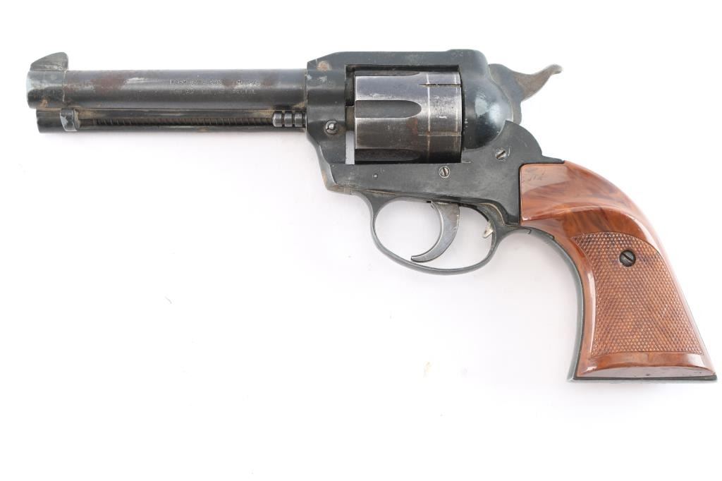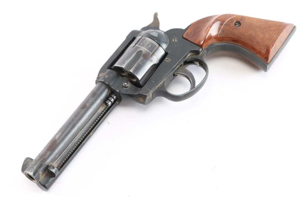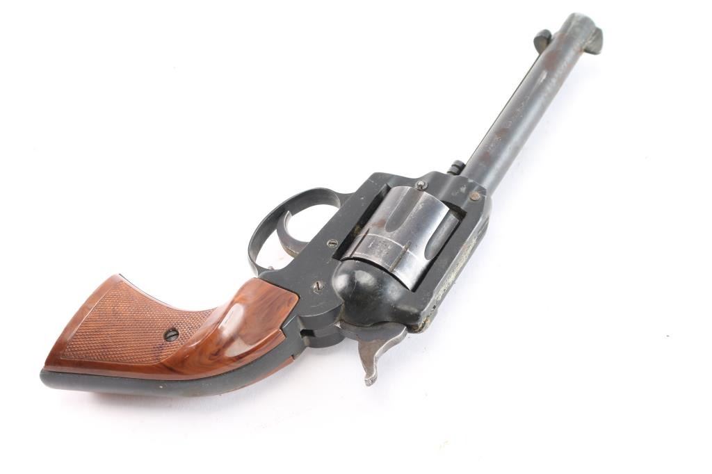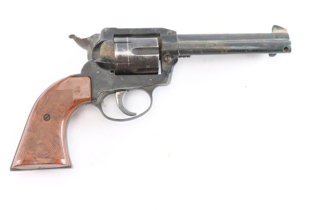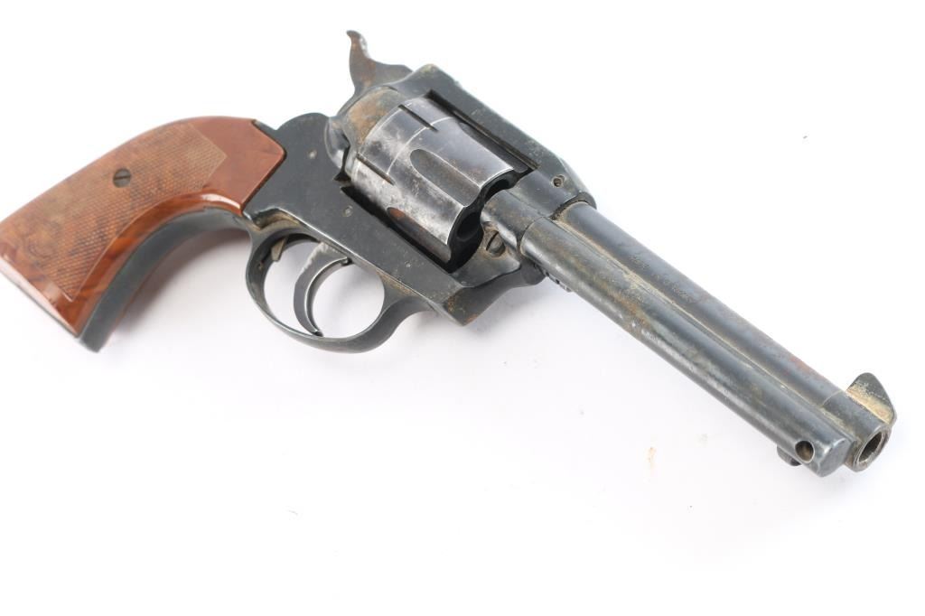 German made single-action centerfire revolver chambered for .38 Special, manufactured circa 1976. Imported by Röhm Gesellschaft (RG) Industries out of Miami, FL. Revolver features a blued and matte black finish, an approximately 4-3/4" round barrel, fixed blade front sight, notched frame rear sight, fluted six-round cylinder, collard cylinder pin head, bird's head style ejector rod button, serrated hammer spur, internal firing pin, smooth curved trigger, smooth grip straps, transfer bar safety, aluminum trigger guard, aluminum frame and grip straps, and two-piece checkered plastic faux wood grips with thumb rest. The original blued finish retained is approximately 60% with edge wear, scratches, general thinning, and a drag line on the cylinder. Metal displays a fair amount of scattered rust, but no deformation. Bore is bright with strong rifling, and the cylinder chambers are also very good. The bore and cylinder need to be cleaned. The action is sticky, but still locks up. The faux wood grips are also very good with some light scratches, and a few small chips.