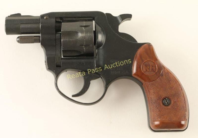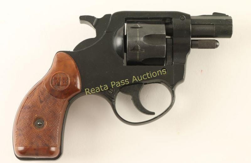 German made snub-nosed double action revolver chambered in .22 Long Rifle. Features a black finish, 1.75" barrel, fixed sights, fluted six-shot swing out cylinder, smooth trigger, wide serrated hammer spur and two-piece RG checkered faux wood plastic grips. Revolver retains approximately 90% of it's original finish showing light wear. Action is strong with solid lock-up, bore is excellent and plastic grips are fine. Condition is very good+. ***Modern Firearm***