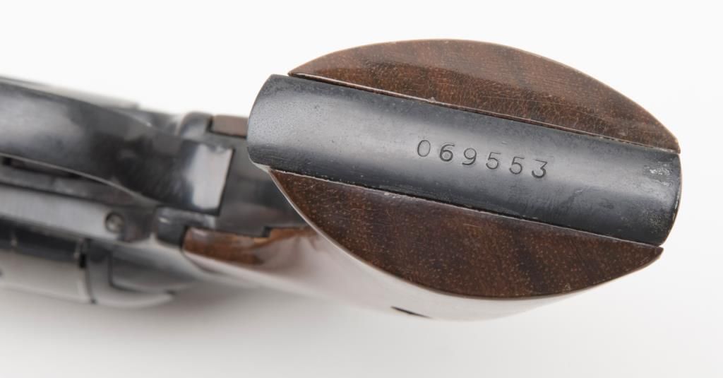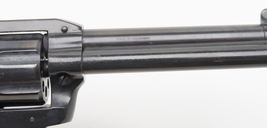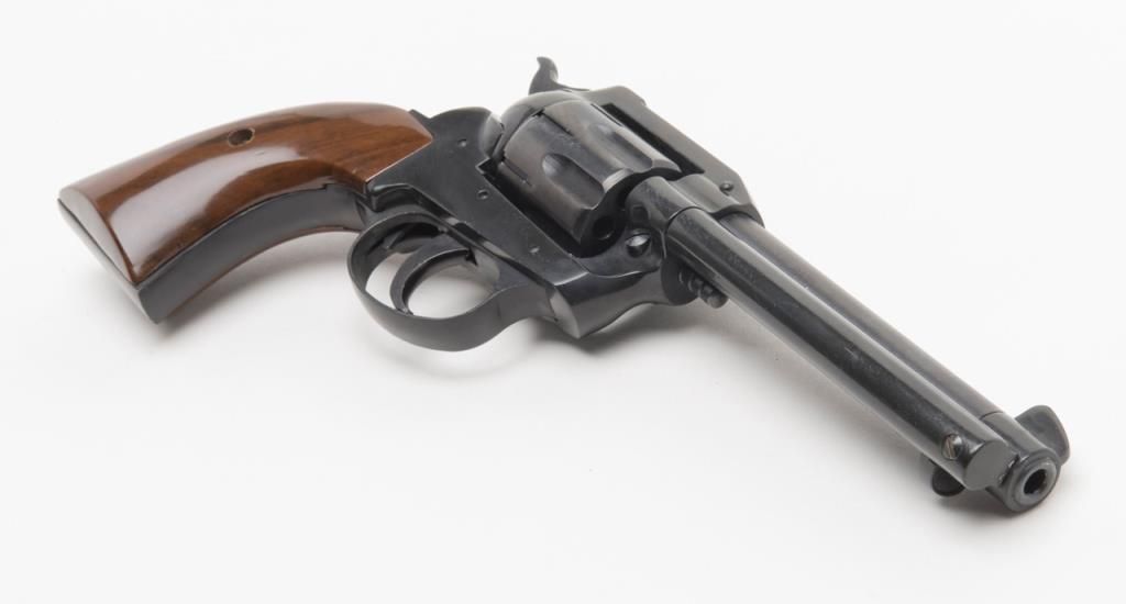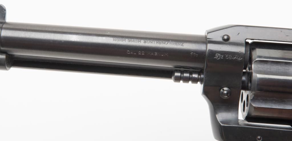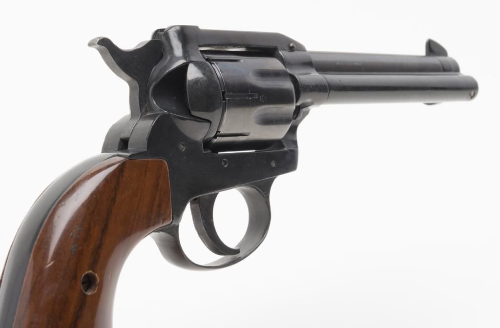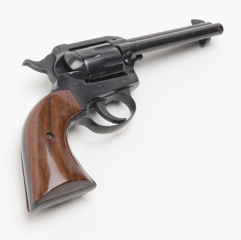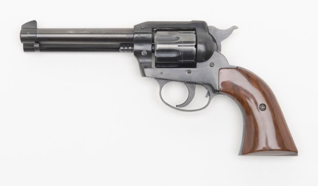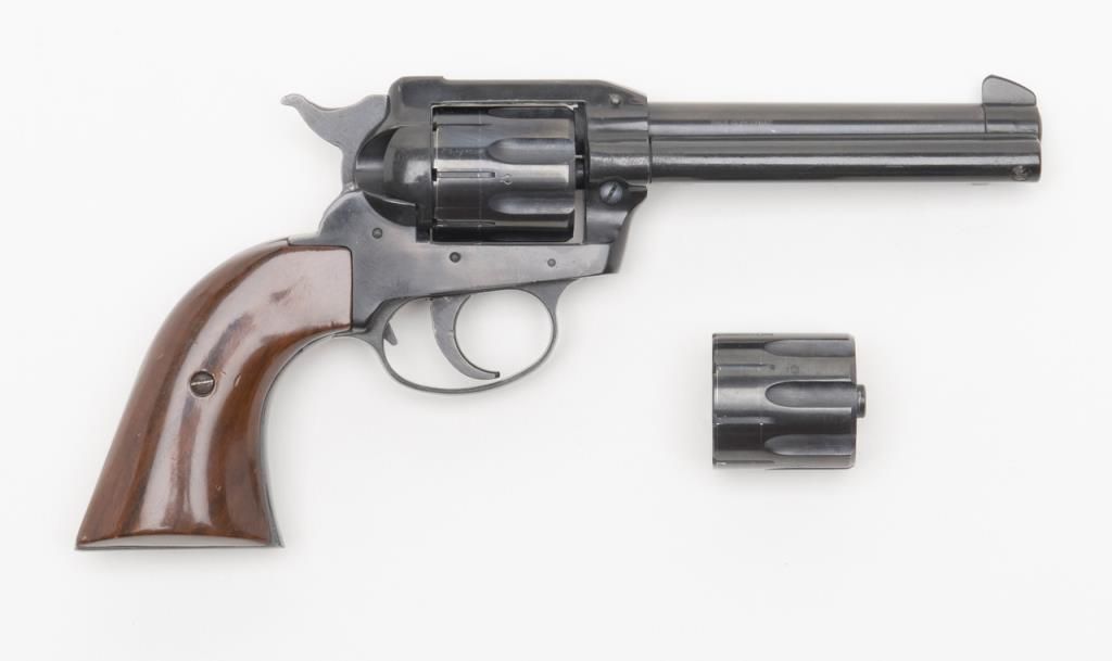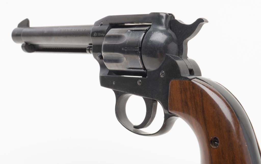 Rohm Single Action revolver, .22 Magnum caliber, Serial #069553. The pistol is in overall very good condition with a 4 5/8” barrel. The pistol retains nearly all of its blued finish with a faint drag line on the cylinder. The smooth woodgrips are in very good condition as well. The pistol comes with an extra cylinder in .22 Long Rifle. The bore is very good, action crisp and markings sharp. (Modern/PPT). Est.: $100-$200.