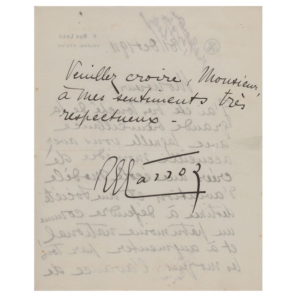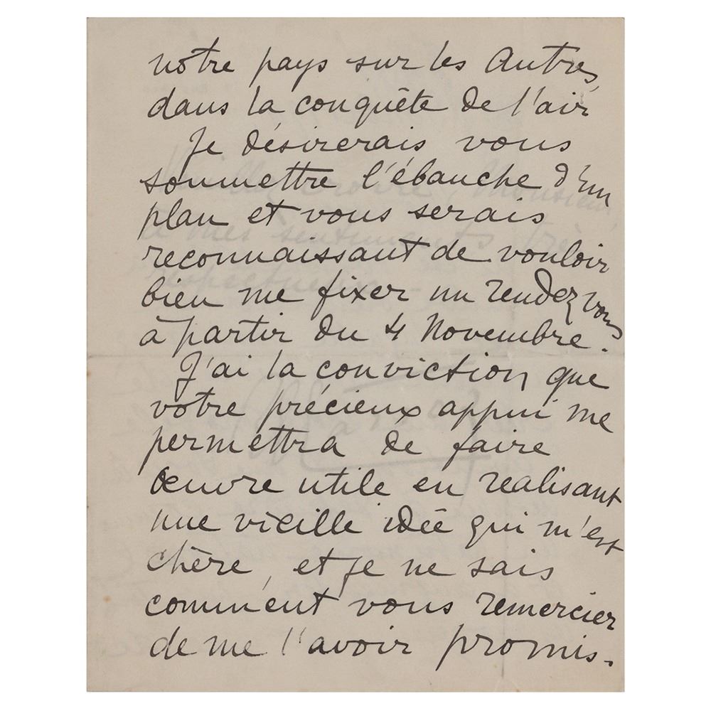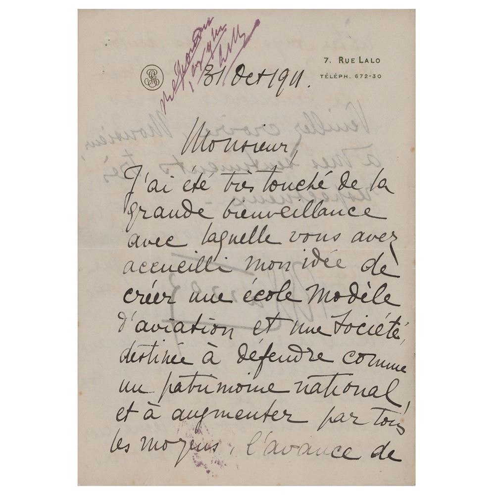 Scarce ALS signed ‰ÛÏGarros,‰Û three pages on two adjoining sheets, 6 x 7.5, personal monogrammed letterhead, October 31, 1911. Untranslated handwritten letter discussing the idea of an aviation school as a national patrimonial conquest of air flight. In fine condition. In 1911, Garros started flying BlÌ©riot XI monoplanes and he entered a number of European air races with this type of aircraft, including the 1911 Paris to Madrid air race and the Circuit of Europe (Paris‰ÛÒLondon‰ÛÒParis), in which he finished second. On September 4, 1911, he set an altitude record of 3,950 m (12,960 ft).