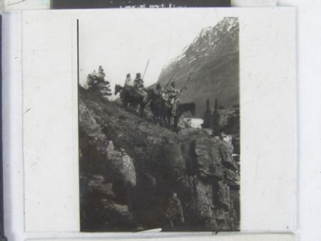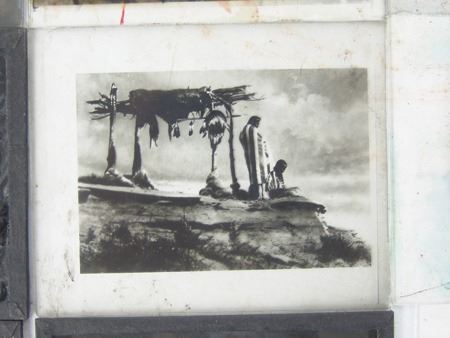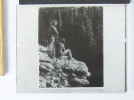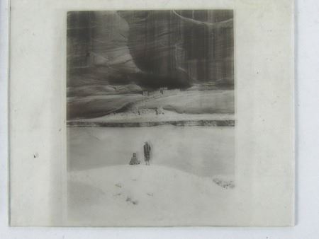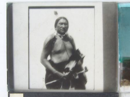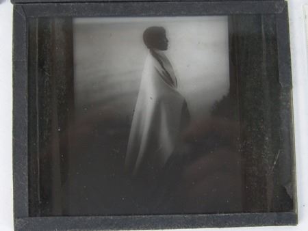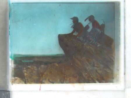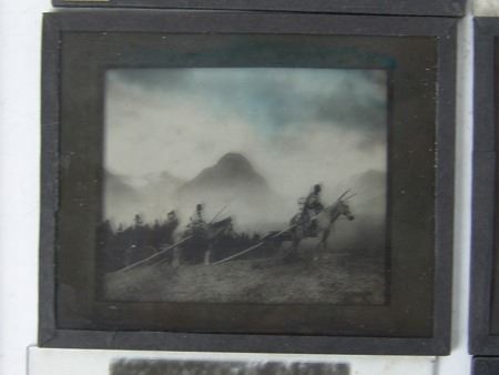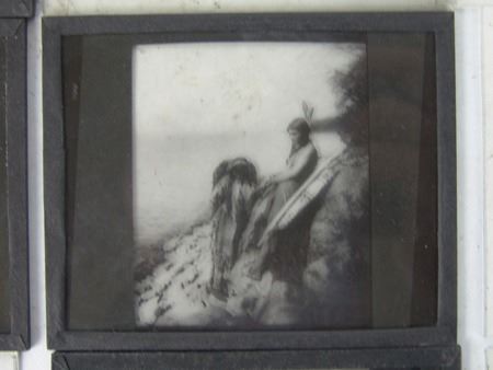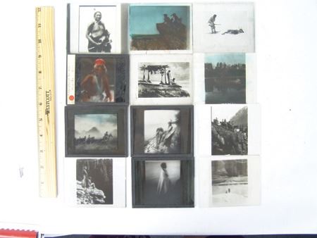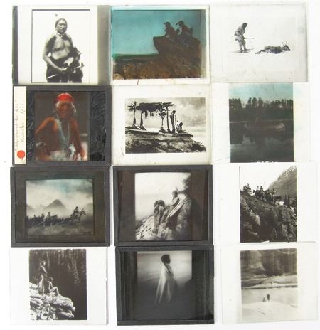 Early 1900s, Rare collection of twelve color and black-and-white glass slides with positive images used for "Magic Lantern" projectors. Includes: "Everywind - Ojibway," "The Parting - Ojibway," "Waiting for the Hunters - Blackfoot," "Shepard of the Hills - Navaho" (hand tinted), "The Landmark," "Watching the Herd - Piagan/Blackfoot" (hand tinted), "Hind Bull - Of the Blood Tribe," "Song of the Canyon," "The Fisherman," "Tribute to the Dead," "End of the Chase," and the very rare "Alone with the Past - Navaho." All in good to very good condition. 4" x 3-1/4" each