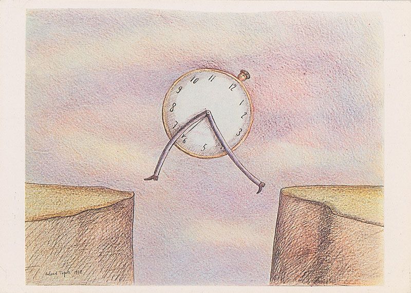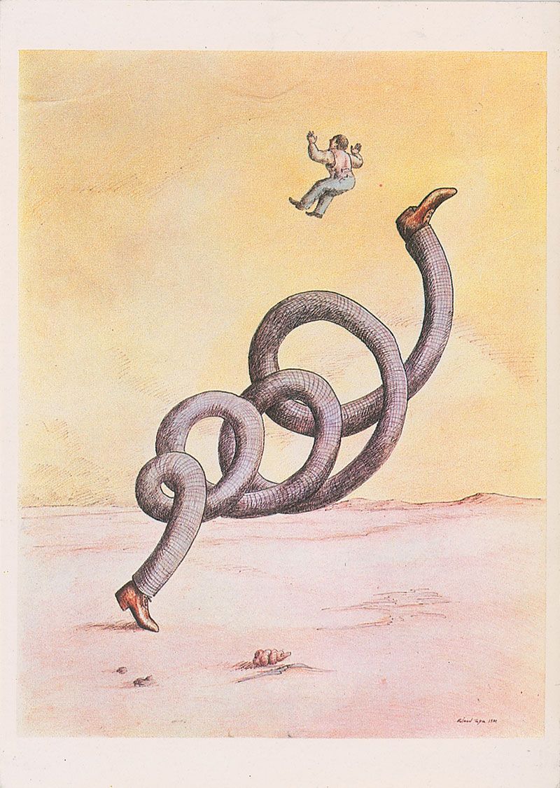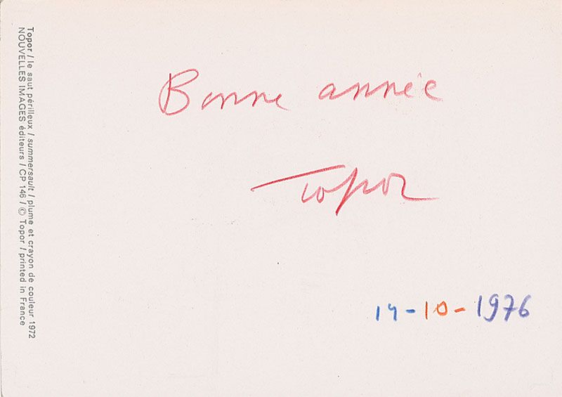 Two color postcards of Topor’s surreal works, 4 x 5.75, each signed on the reverse in red pencil and dated October 17, 1976. In overall fine condition.