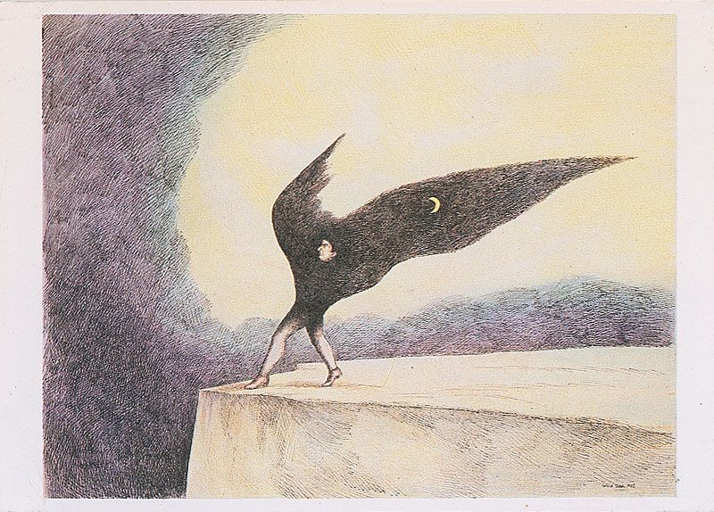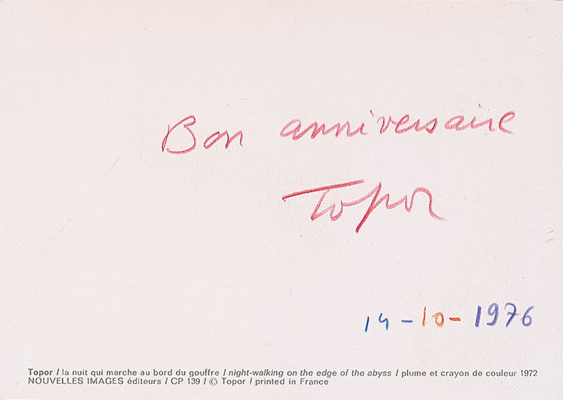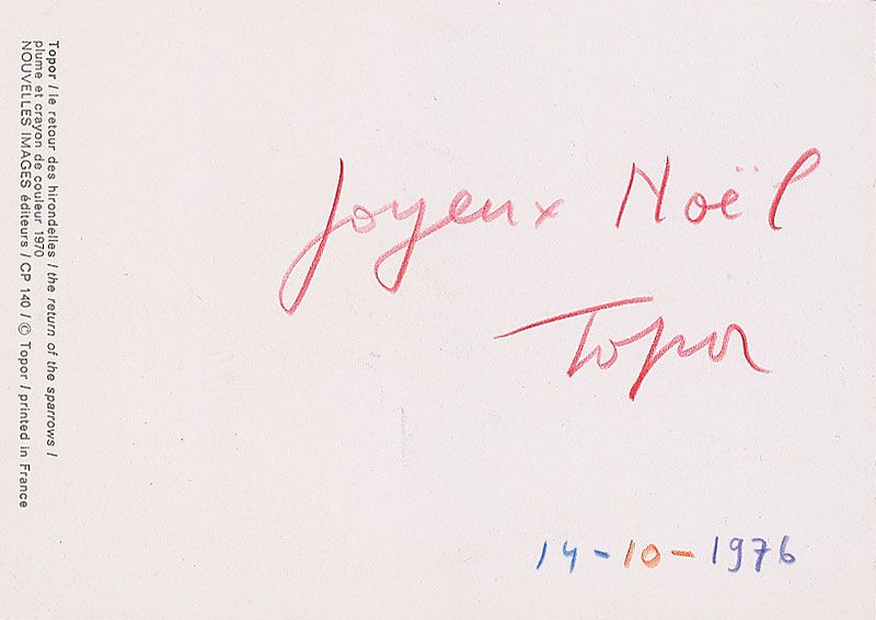 Two color postcards of Topor’s surreal works, 4 x 5.75 and 5.75 x 4, each signed on the reverse in red pencil and dated October 14, 1976. In overall fine condition.