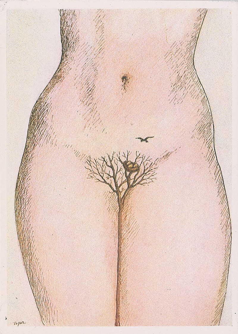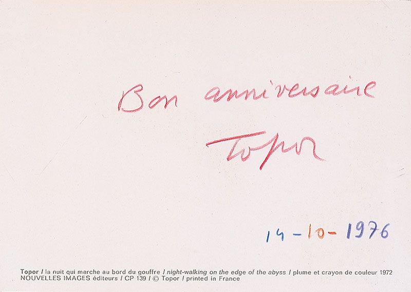 Two color postcards of Topor’s surreal works, 4 x 5.75 and 5.75 x 4, each signed on the reverse in red pencil and dated October 14, 1976. In overall fine condition.