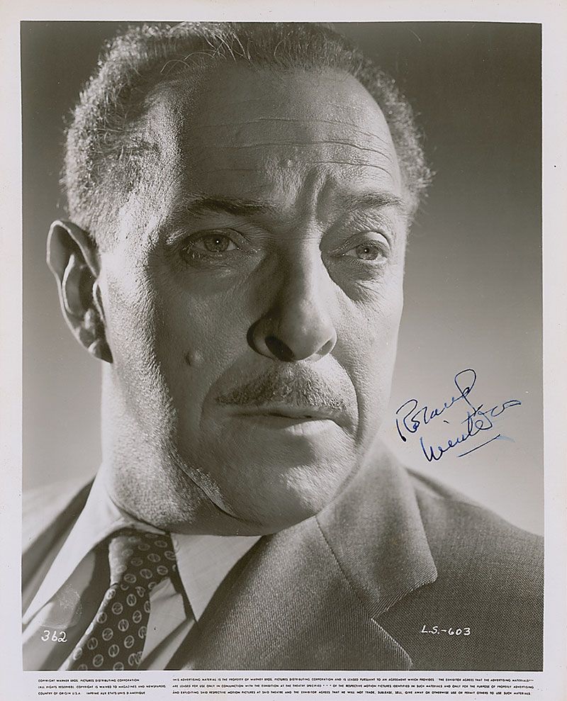 Glossy 8 x 10 Warner Bros. publicity photo, signed in blue ink. In fine condition, with some irregular adhesion and a slight brush to the signature.