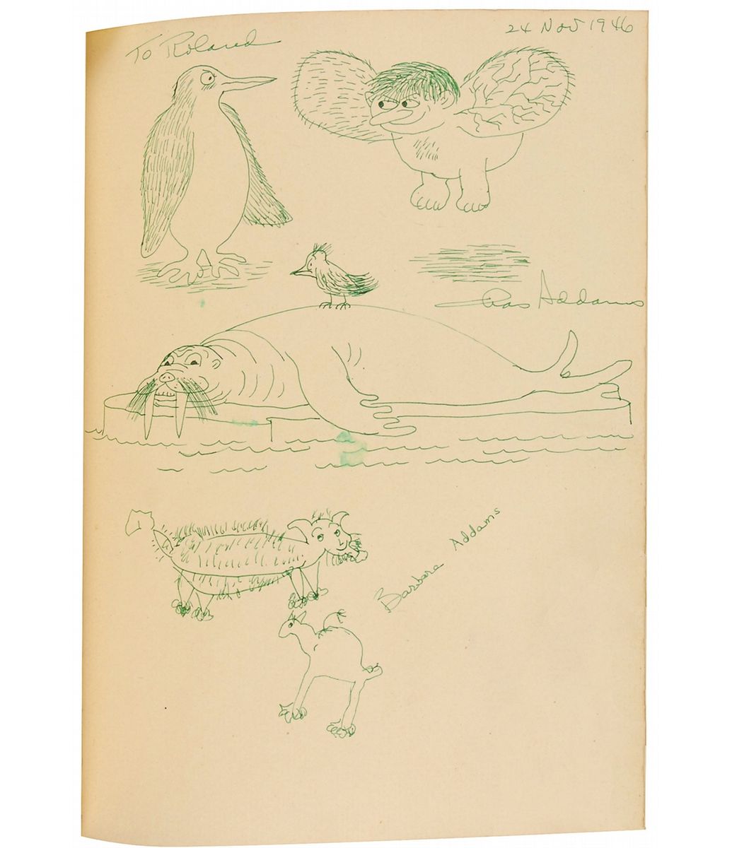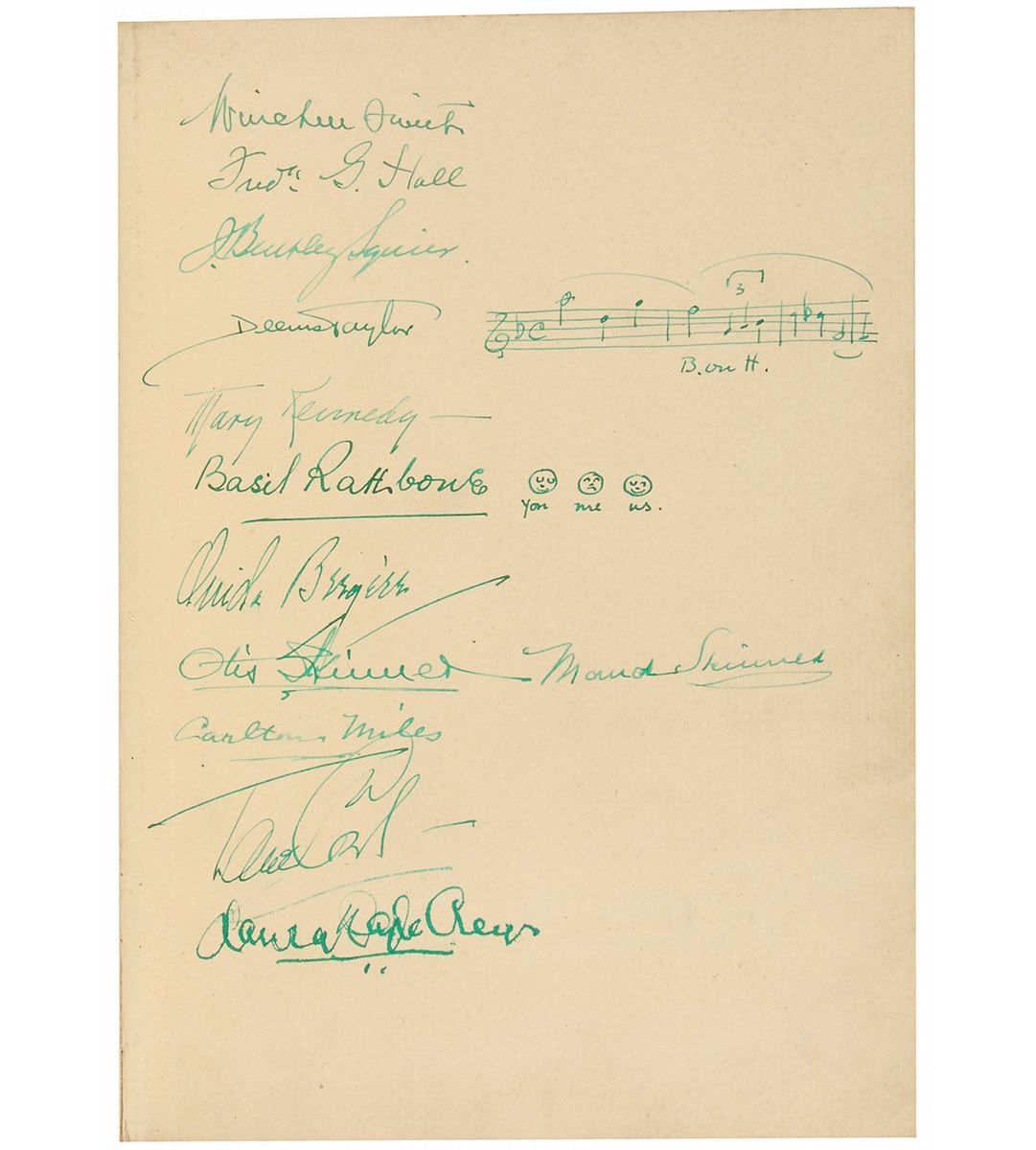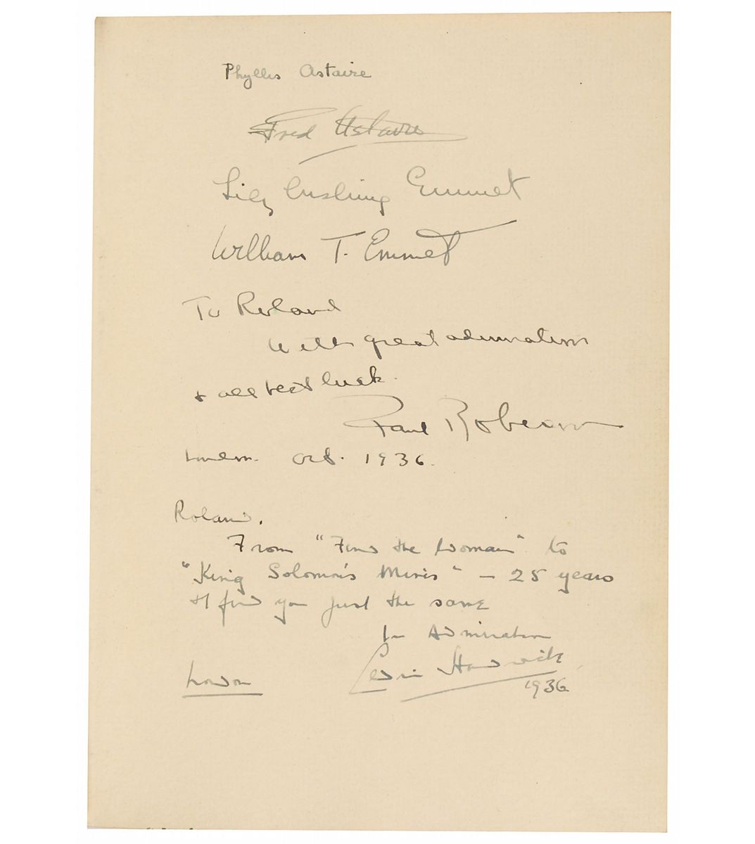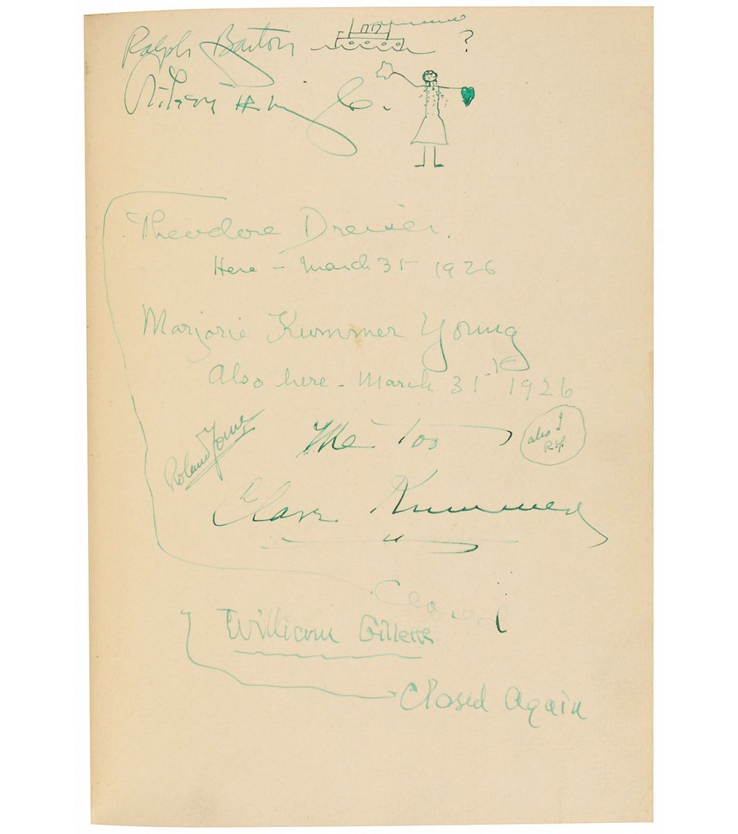 British actor (1887–1953) who played a wide variety of roles during a lengthy career that lasted from the end of WWI through the early 1950s, coming into contact with numerous legends and celebrities along the way. Young’s personally-owned guest book, 7.25 x 9.75, bearing his bookplate affixed to a free end page, signed inside by 210 of his friends and acquaintances, most being notable celebrities, authors, and artists, including: Basil Rathbone, Theodore Dreiser, Alexander Woollcott, Robert Benchley, William Beebe, Ruth Gordon, John Barrymore, Paul Lukas, Dick Barthelmess, Noel Coward, John McCormack, P. G. Wodehouse, Ronald Colman, Fred Astaire, Paul Robeson, Joan Blondell, Dick Powell, Charles Addams, James Cagney, W. Russell Flint, Irwin Cobb, Deems Taylor (two AMQSs), and Laura Hope Crews. Many have added warm and personal inscriptions to Young, as well as some with AMQSs or small sketches, highlighted by a half-page filled with three humorous animals drawn by Charles Addams. In overall fine condition. A high-quality visitor’s book featuring a wide array of Hollywood’s movers and shakers.